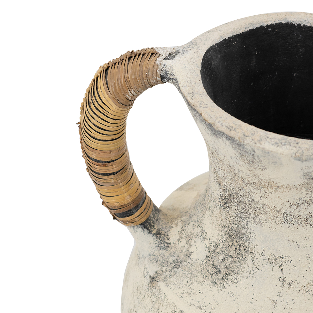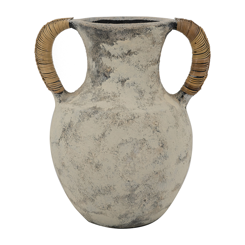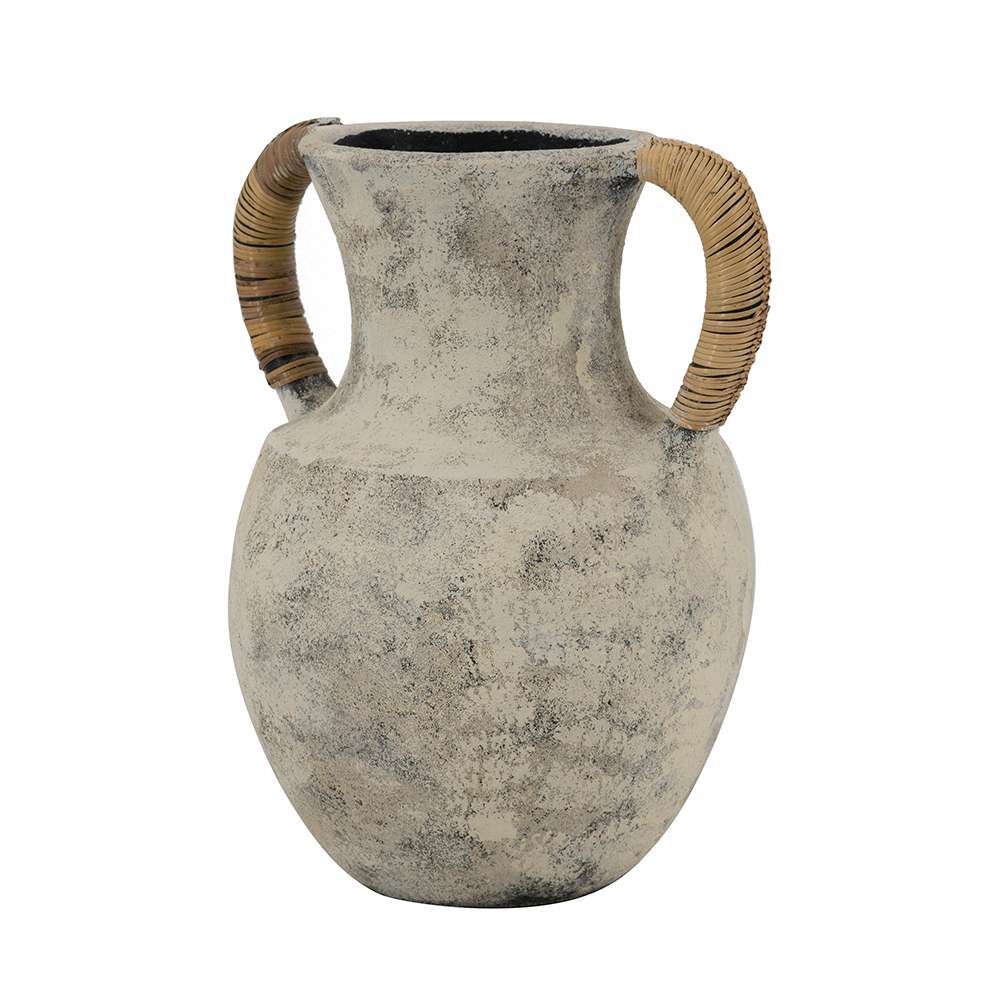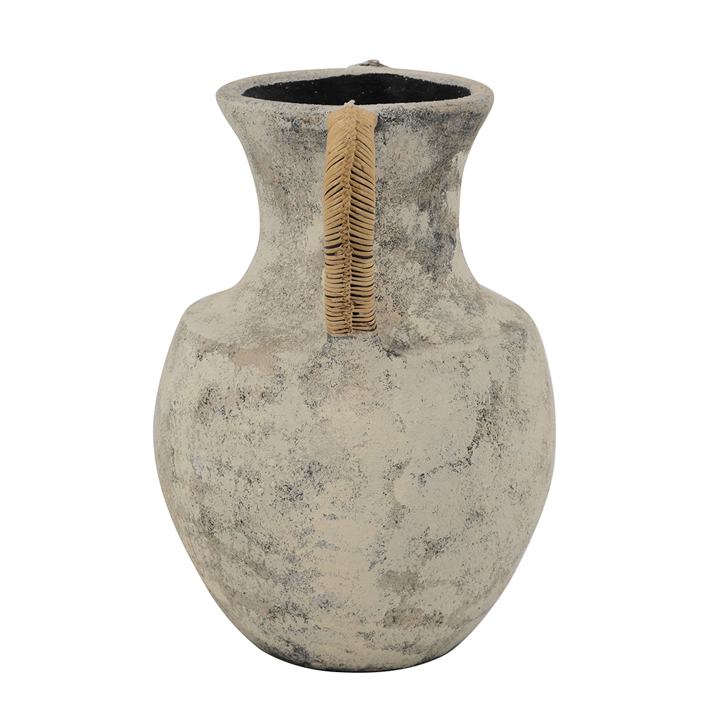 Elevate your decor with this handcrafted terracotta vase, featuring a weathered gray-beige finish that mimics aged stone for authentic rustic charm. Natural rattan-wrapped handles add organic texture and easy portability. Its bulbous urn shape with flared neck is perfect for flowers, stems, or as a standalone accent. Earthy tones blend with bohemian, farmhouse, or minimalist styles.