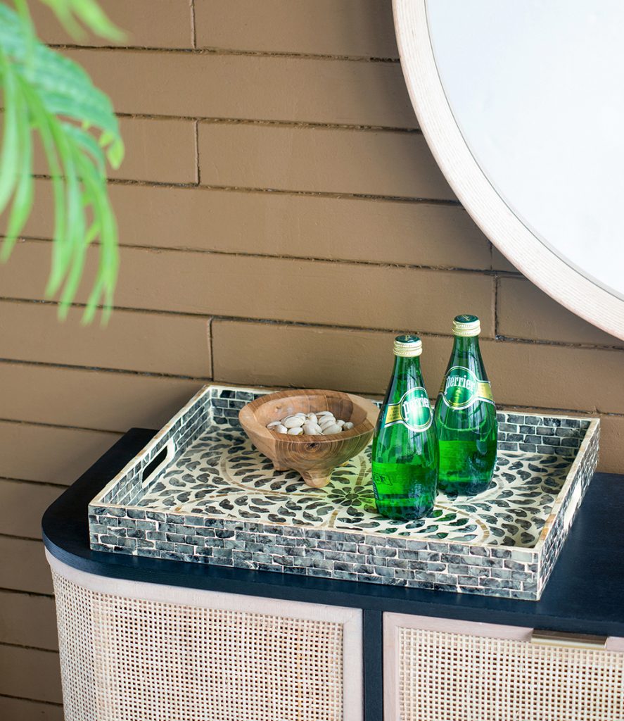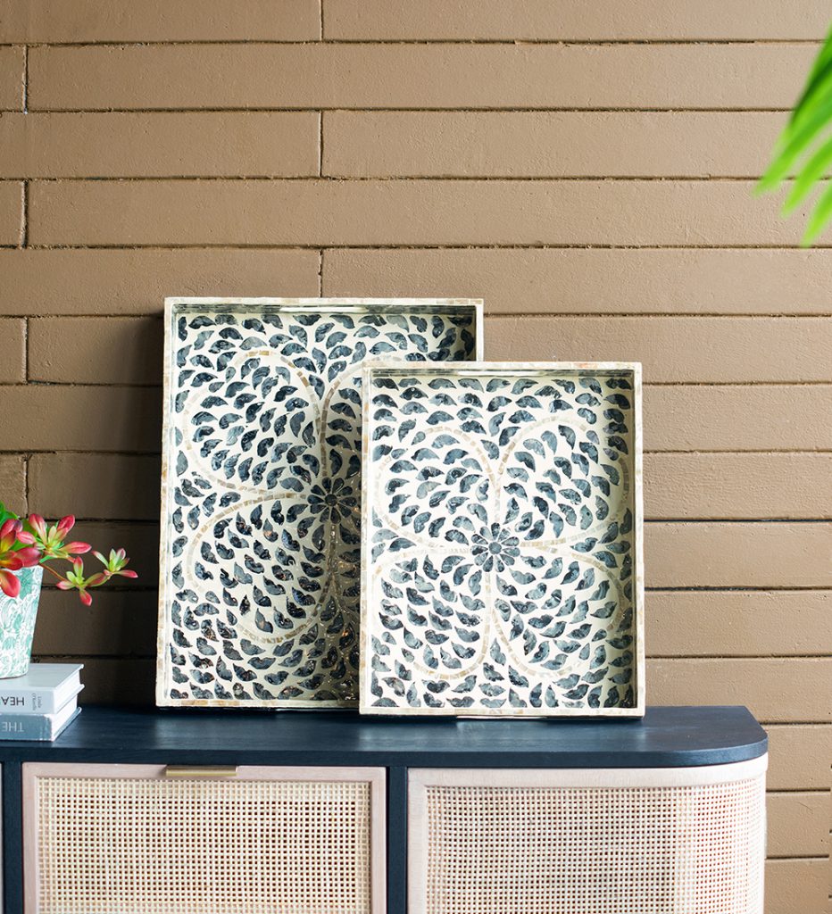Visually impressive and undeniably useful, this large black Capiz tray with handles has a dynamic and dutiful look. The rectangular frame presents a floral design along the surface, while the side handles bring appealing convenience. Staged on the buffet or used in the kitchen, this tray makes for a very effective accent piece.