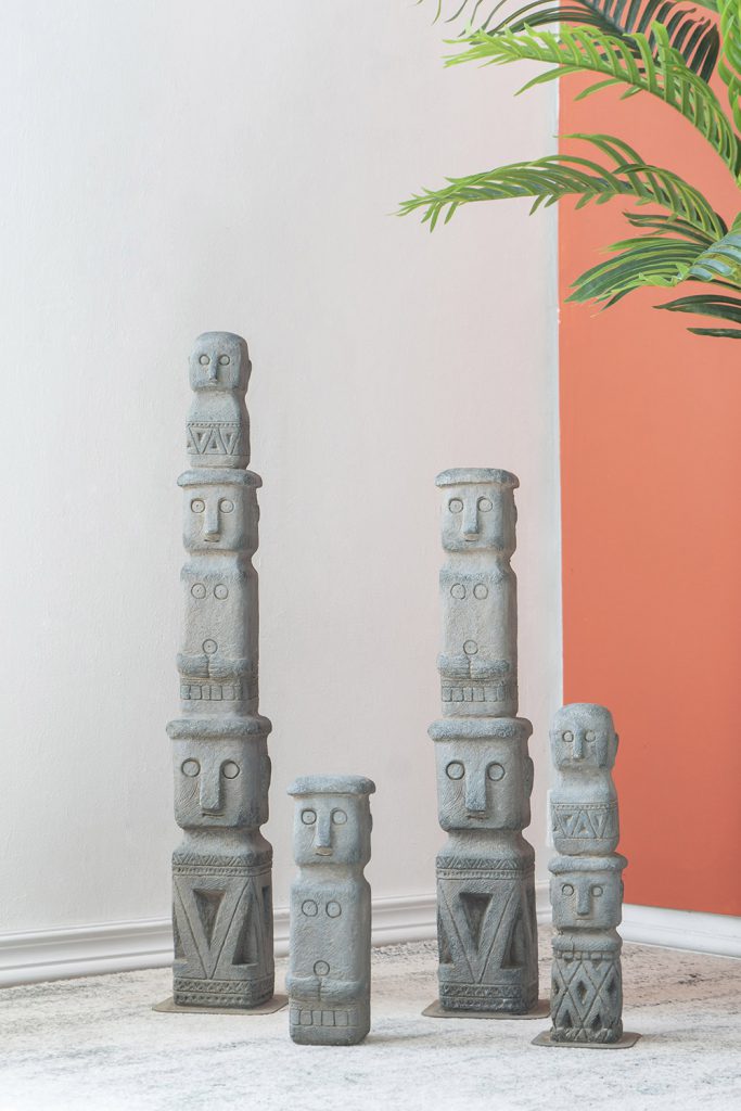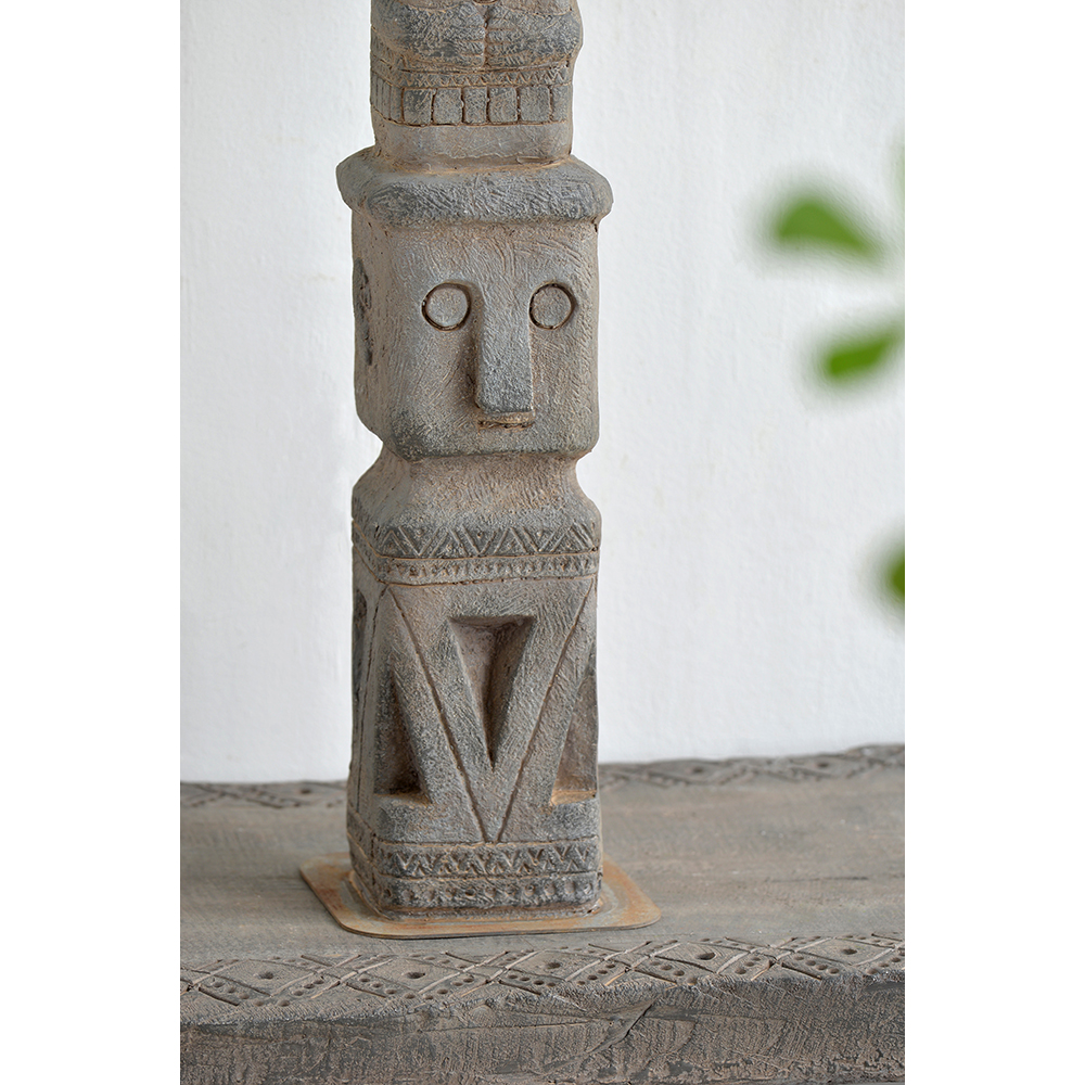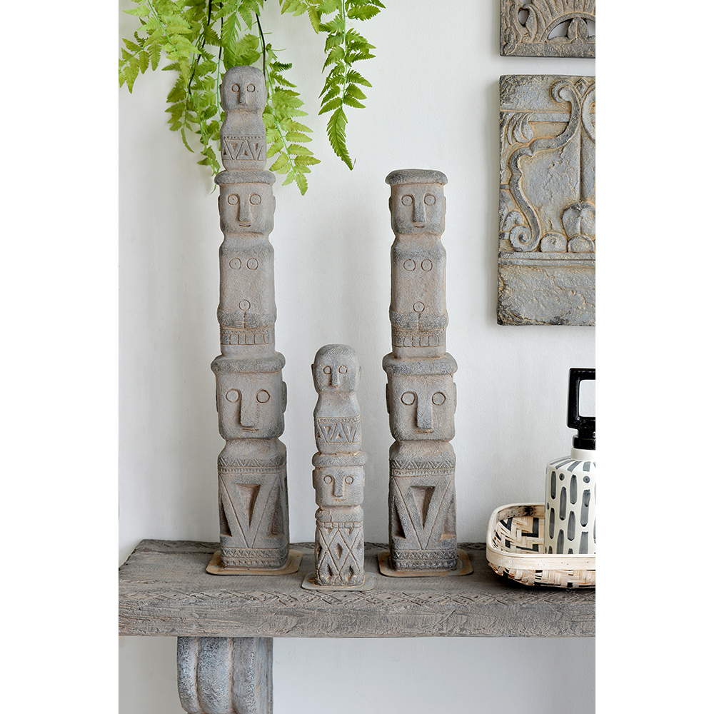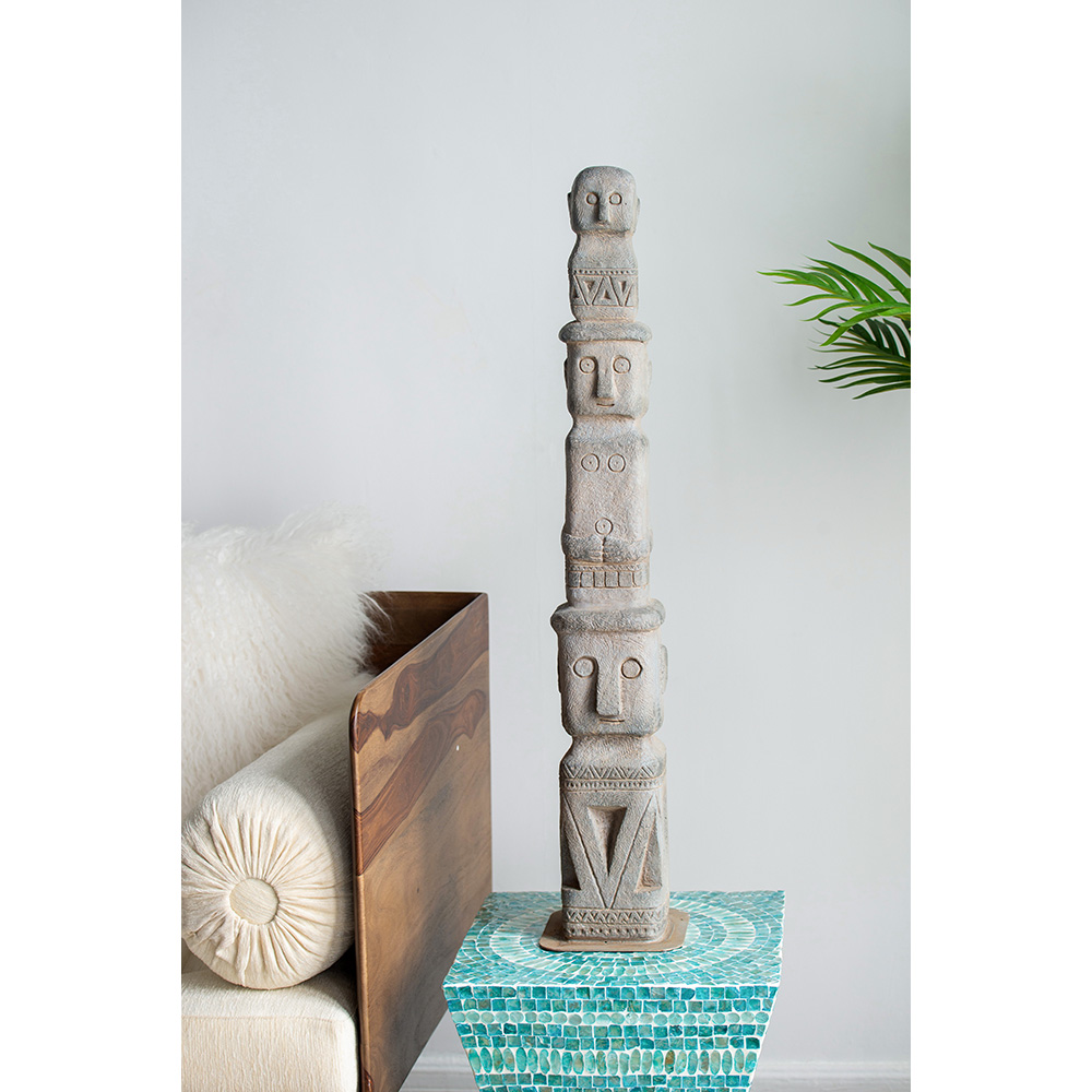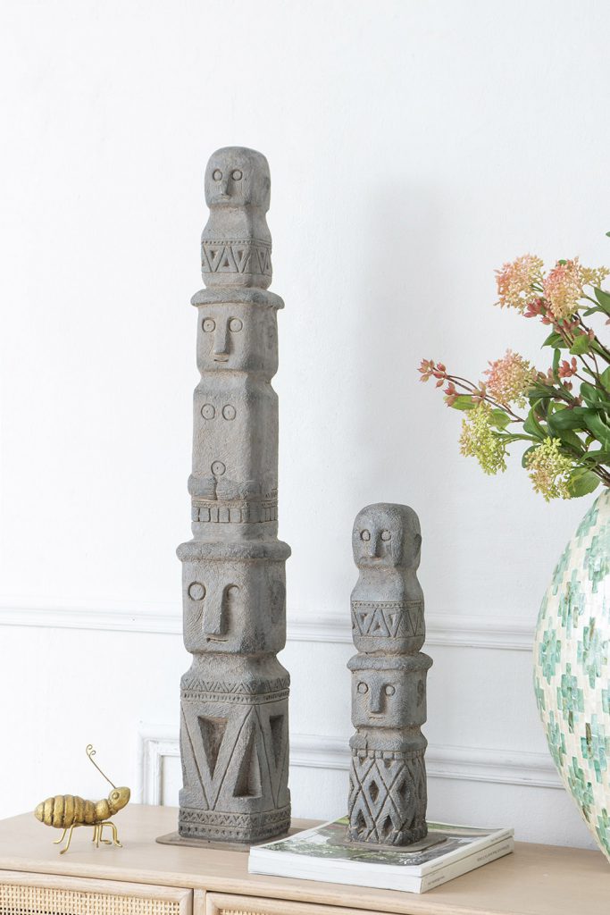 At 34″ tall, this stacked tribe decor is designed to make a grand impression in a garden or large entryway. This totemic piece has an aged-looking gray finish and deeply carved figures, indicative of its ancient relic design inspiration. It’s a slender piece, so is well-suited to tall, narrow spaces.