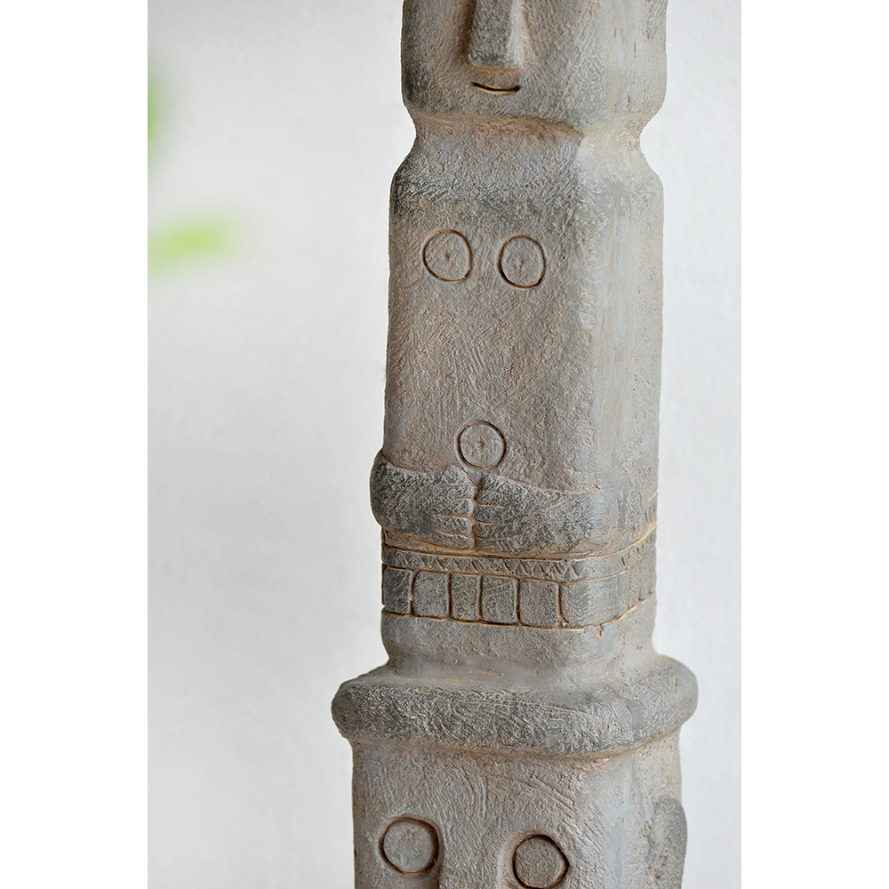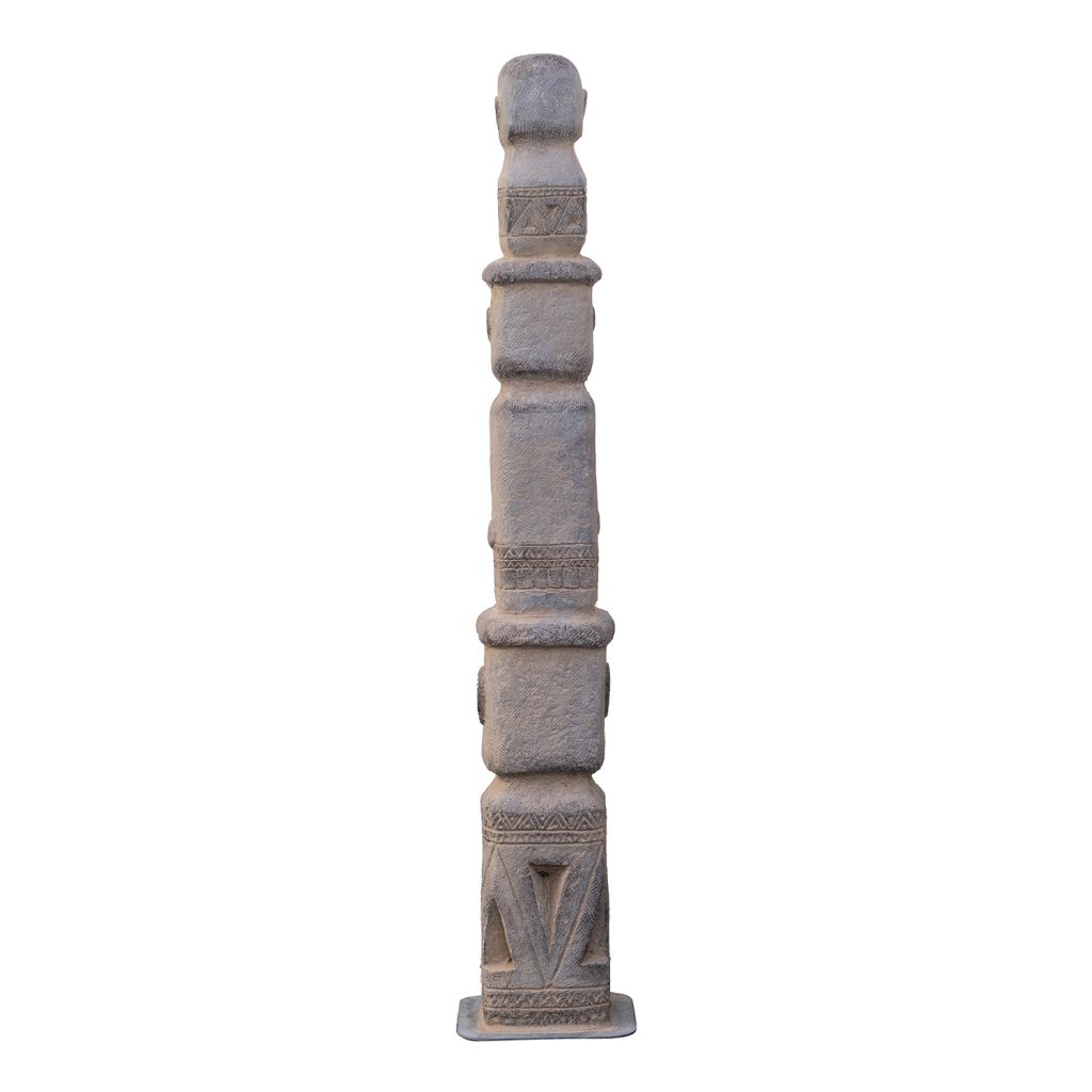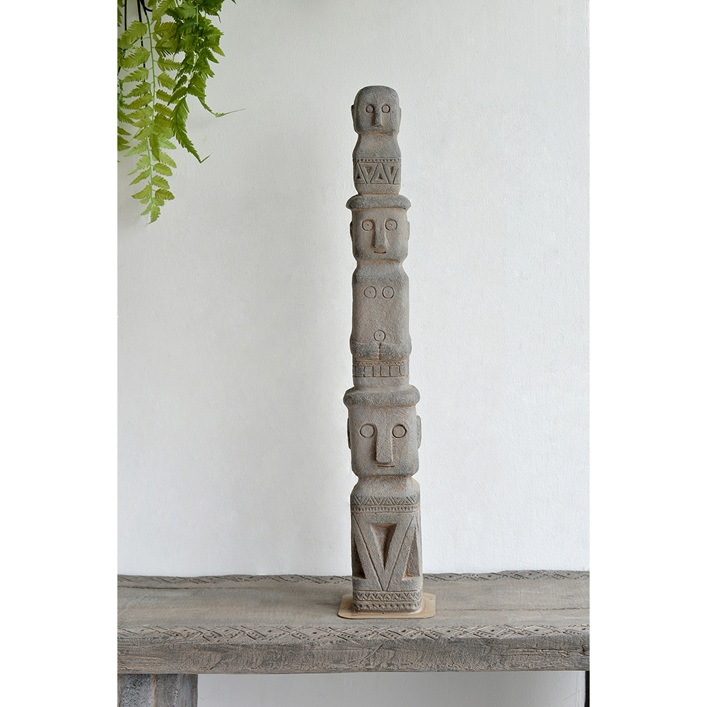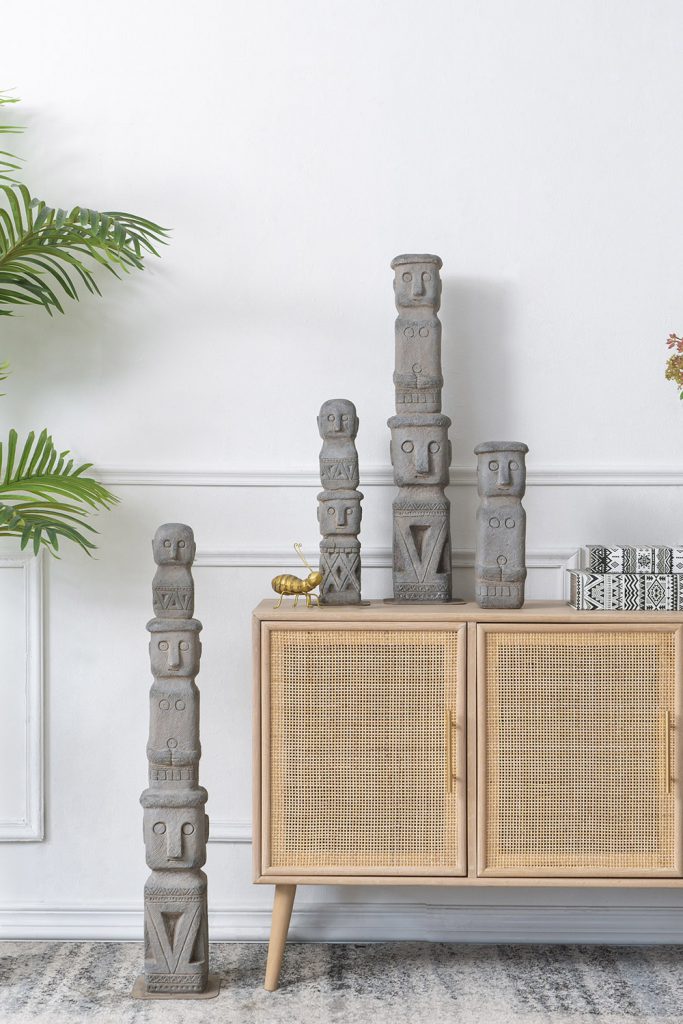 At 34″ tall, this stacked tribe decor is designed to make a grand impression in a garden or large entryway. This totemic piece has an aged-looking gray finish and deeply carved figures, indicative of its ancient relic design inspiration. It’s a slender piece, so is well-suited to tall, narrow spaces.