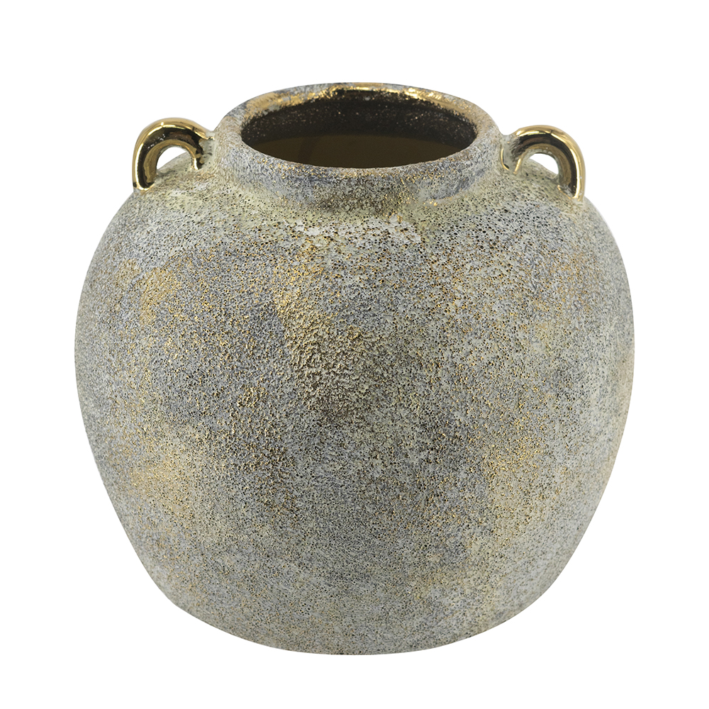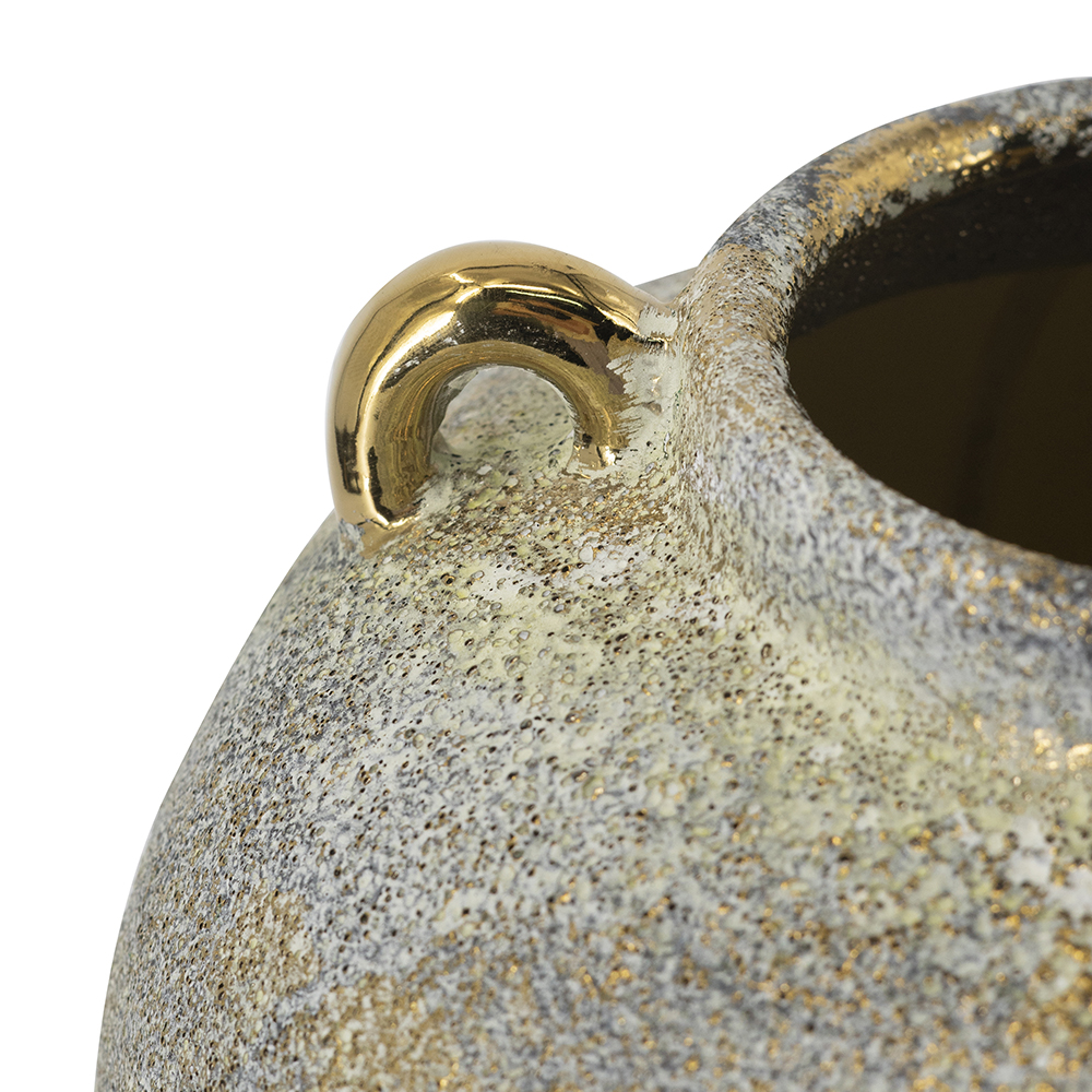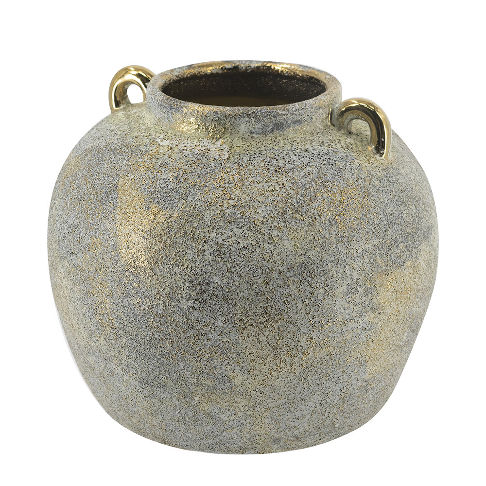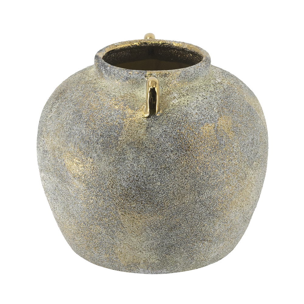 Inspired by ancient European pottery, this vase features a round, pot-like silhouette, a textured gray finish, and touches of luxurious gold. Whether displayed on its own or filled with dried florals, it is sure to draw the eye from any tabletop, mantel, or sideboard.