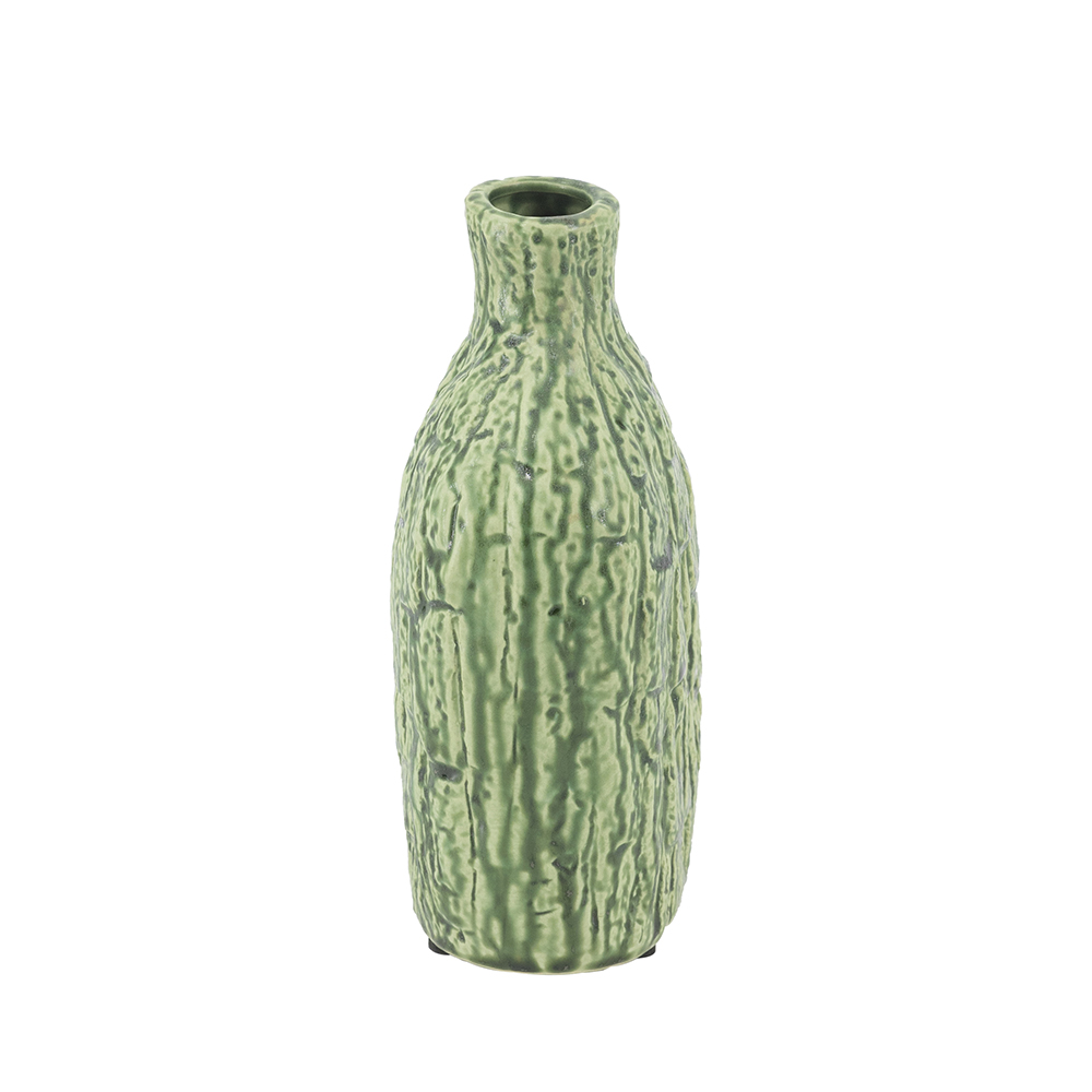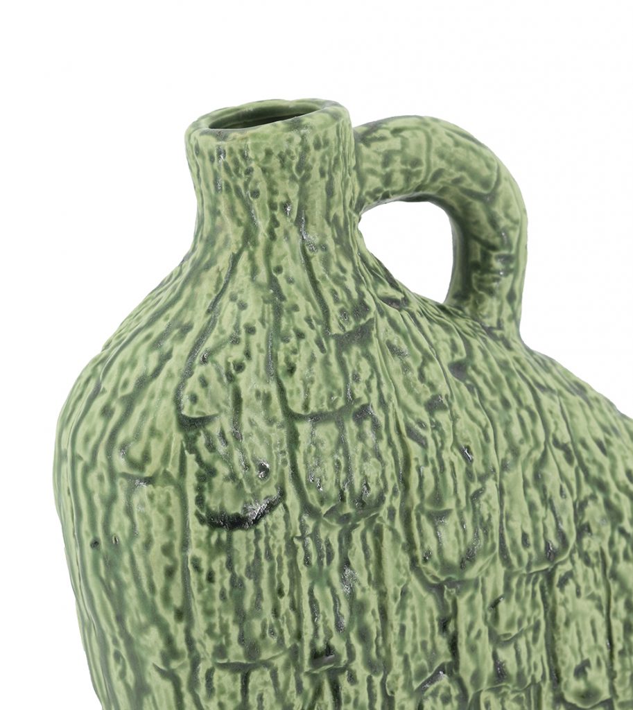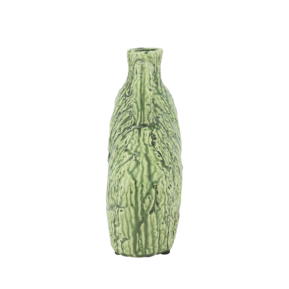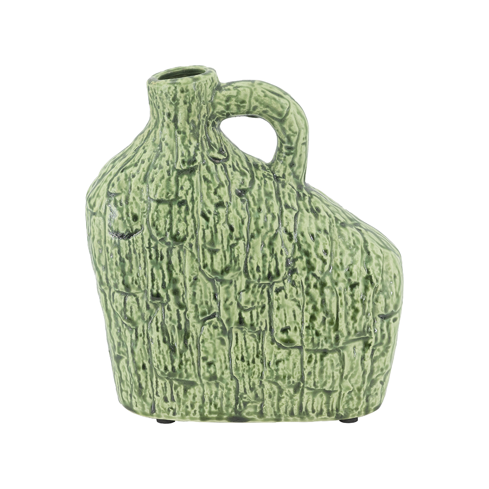 Blending organic modern charm with abstract artistry, this vase features a unique asymmetrical silhouette and a textured green finish reminiscent of tree bark. Perfectly sized for a mantel, tabletop, shelf, or counter, it draws the eye whether displayed as a standalone accent or paired with short-stemmed florals.