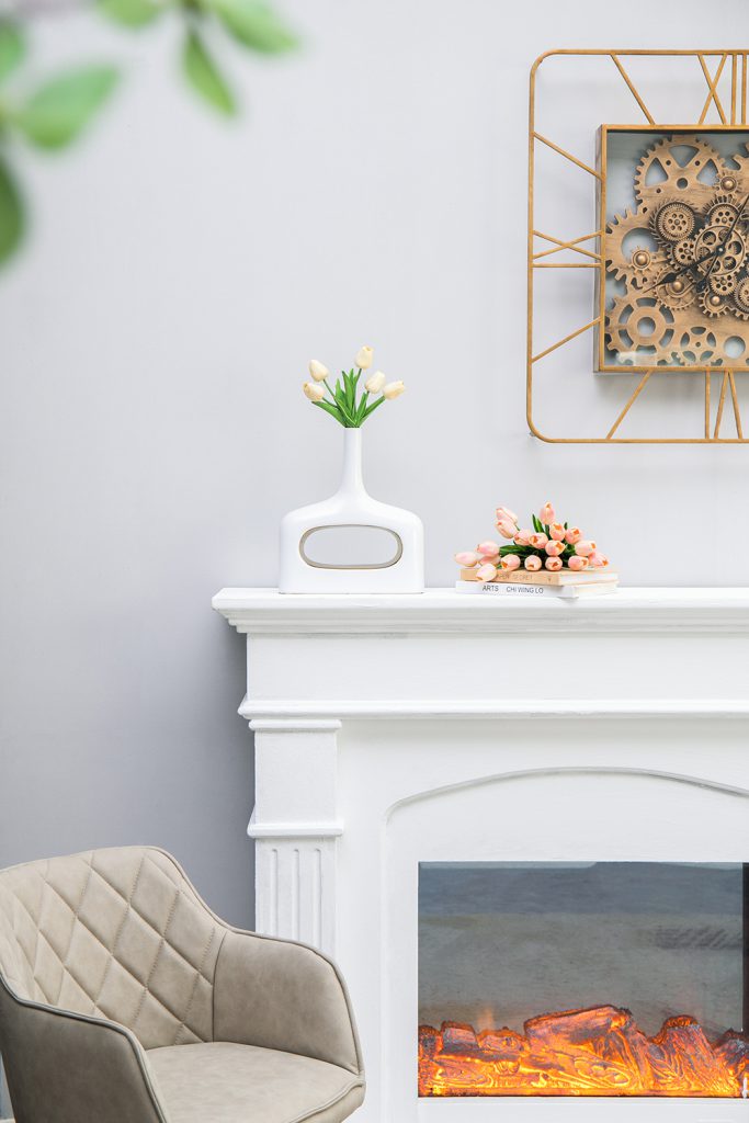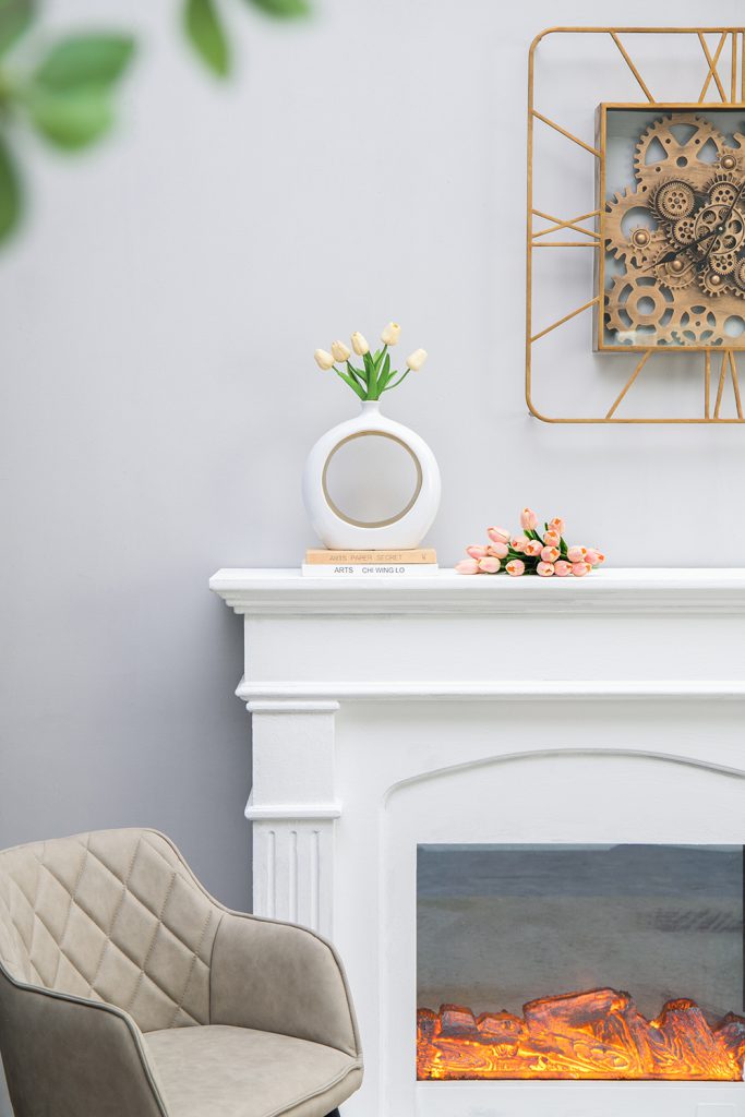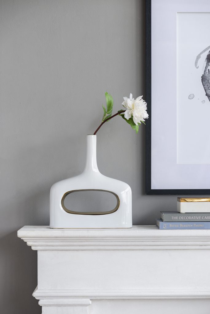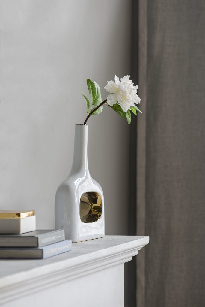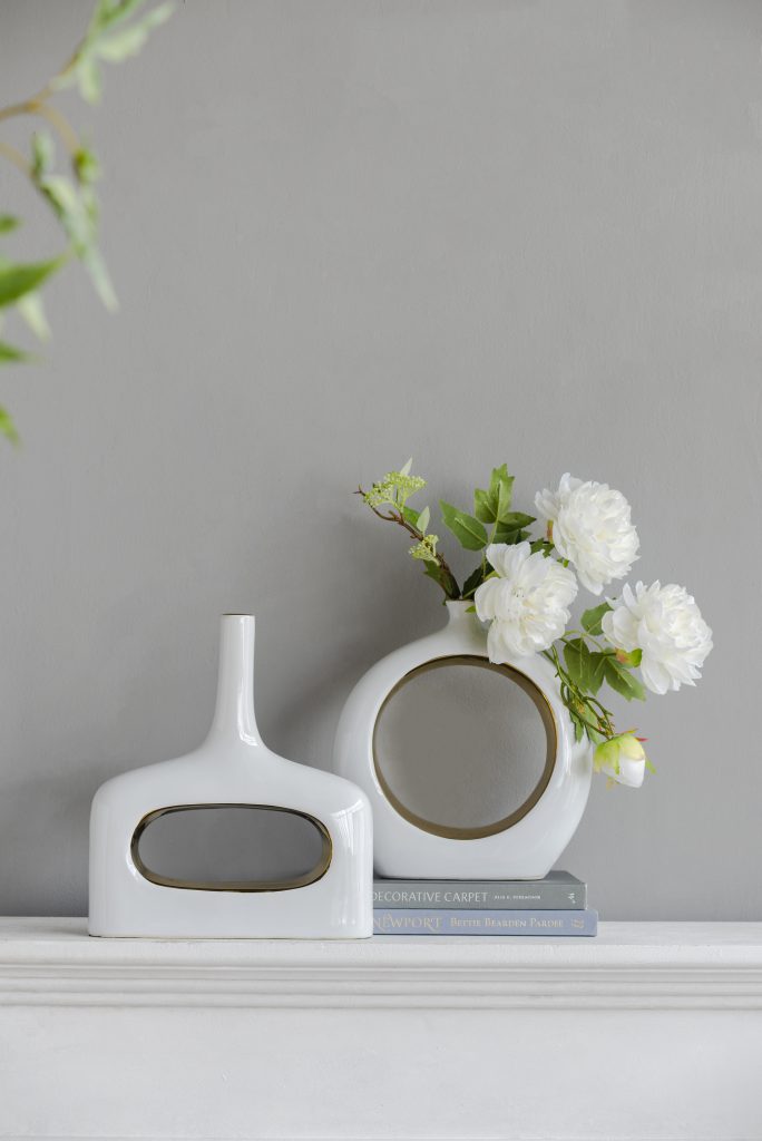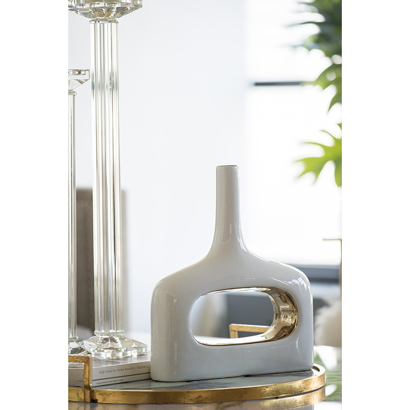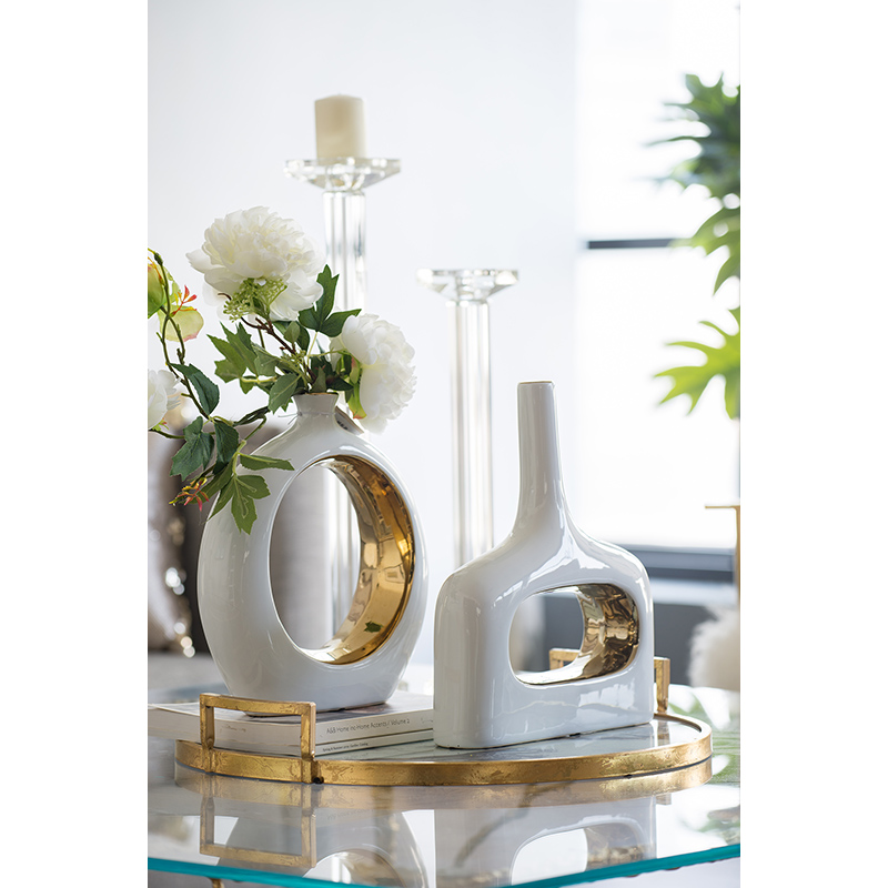 An open center gives a sleek, contemporary look and feel to this decorative square vase. A narrow neck accentuates its voluptuous shape, which is adorned with a modern white and gold finish. Place it on any tabletop or side table as a gorgeous accent.