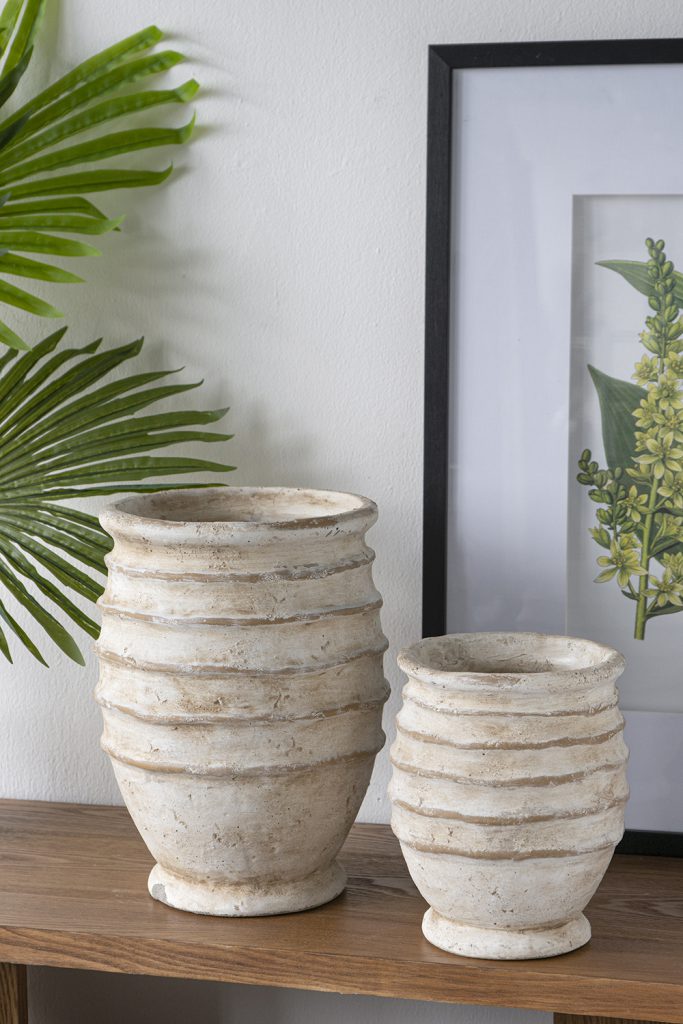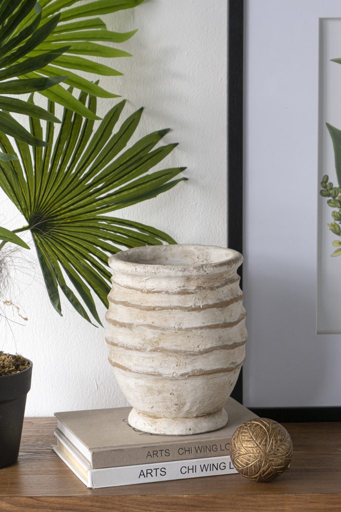 Capturing the artistic side of earthy decor, this vase features a round, ridged silhouette and a weathered beige finish, creating a display reminiscent of ancient pottery. Whether used as a standalone accent or paired with a lush floral arrangement, it will elevate any indoor or outdoor space.