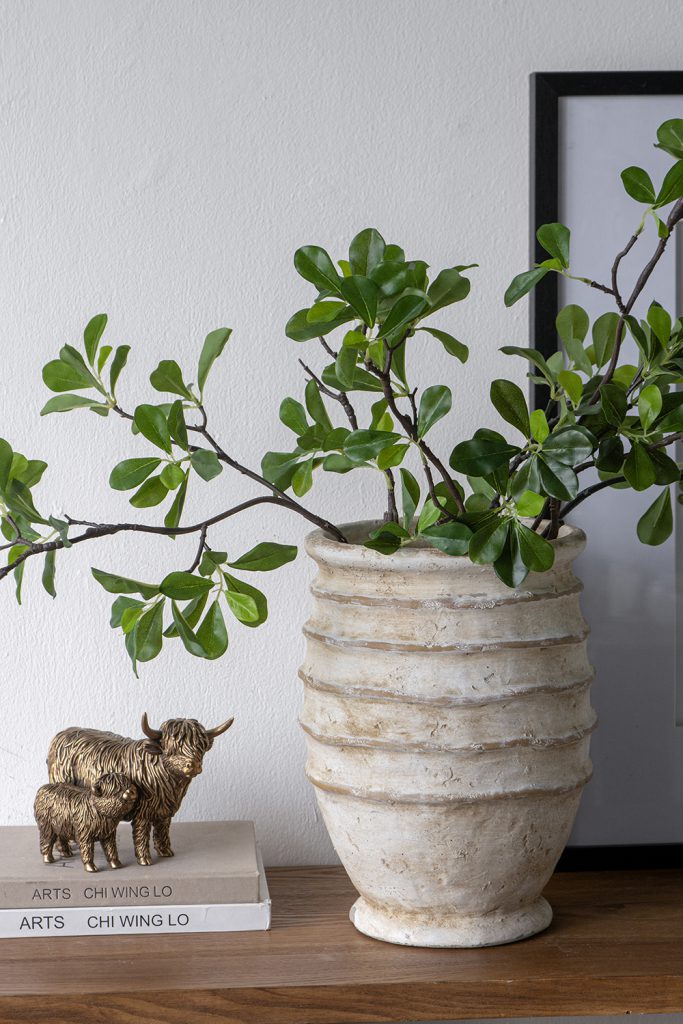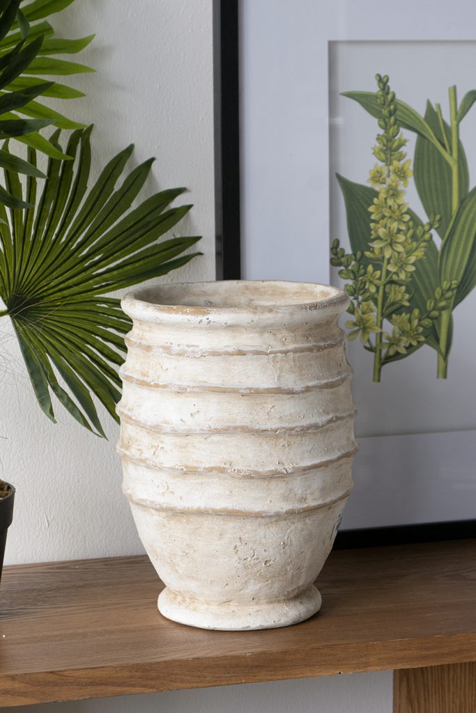 Capturing the artistic side of earthy decor, this vase features a round, ridged silhouette and a weathered beige finish, creating a display reminiscent of ancient pottery. Whether used as a standalone accent or paired with a lush floral arrangement, it will elevate any indoor or outdoor space.