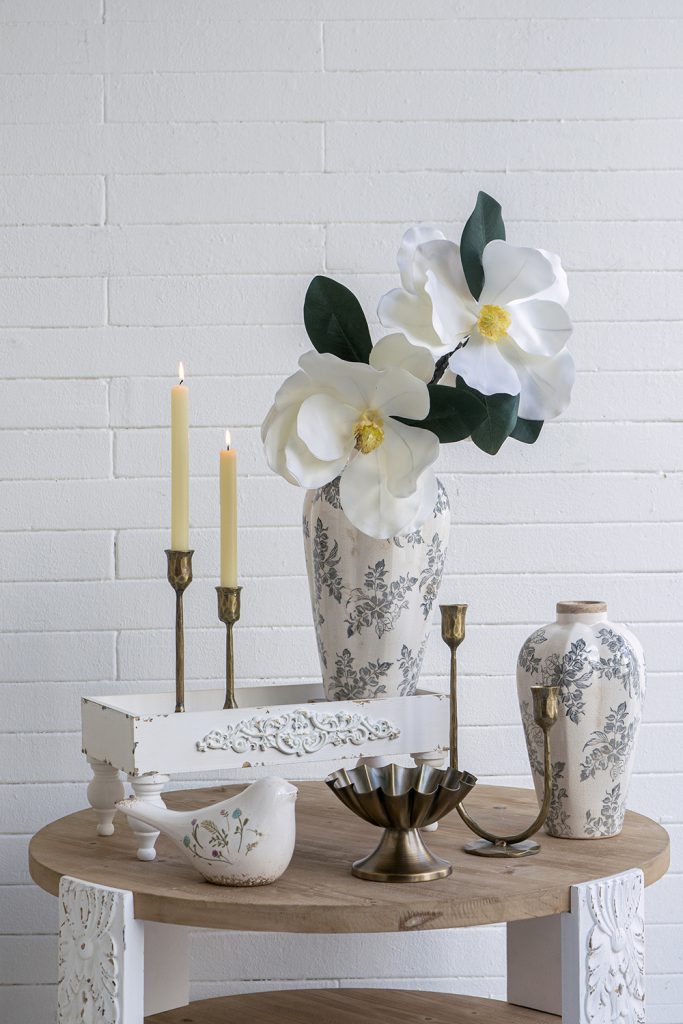Inspired by vintage European pottery, this accent vase showcases a classic curved silhouette, a distressed white hue, and a muted gray floral motif. Whether displayed empty or filled with a lush flower arrangement, it will command the eye from any tabletop, mantel, or sideboard.