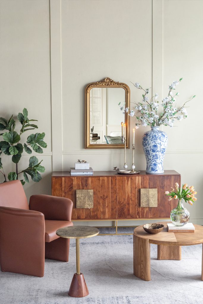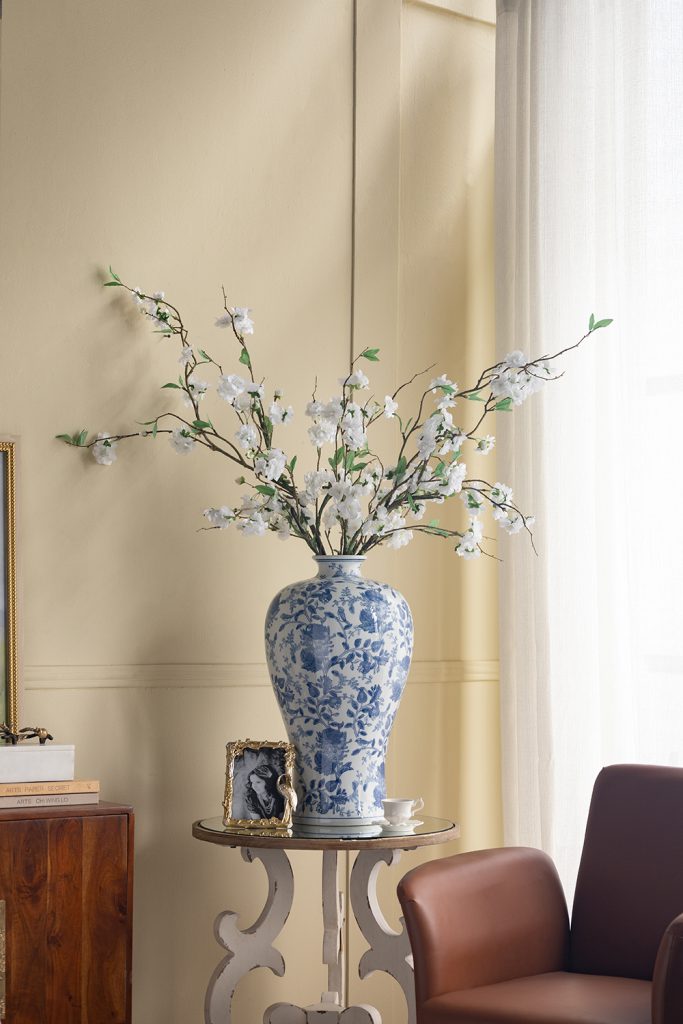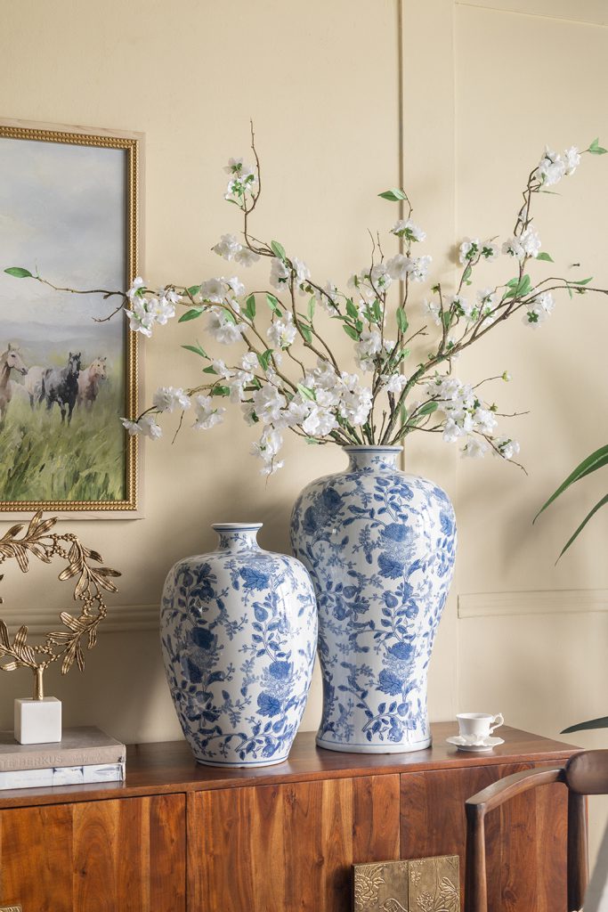 Inspired by the elegant designs of Ming Dynasty China, this vase features a round, tapered silhouette, a gently flared opening, and dense blue floral motifs that pair beautifully with a crisp white backdrop. Perfectly sized to stand alone or showcase long stems and branches, it is sure to draw the eye from any tabletop, dresser, or sideboard.