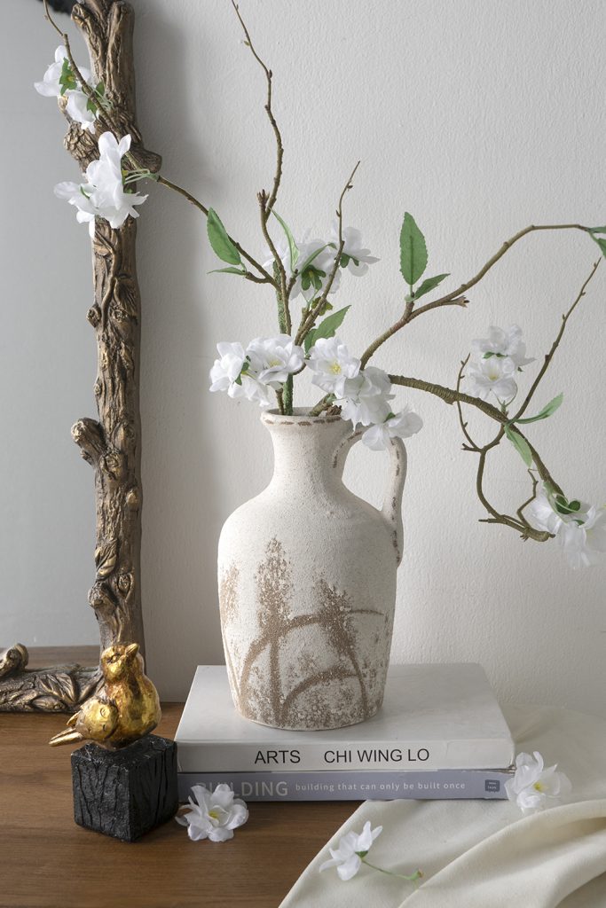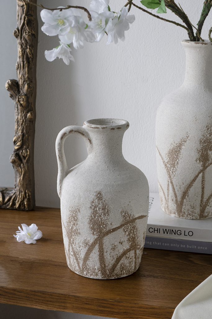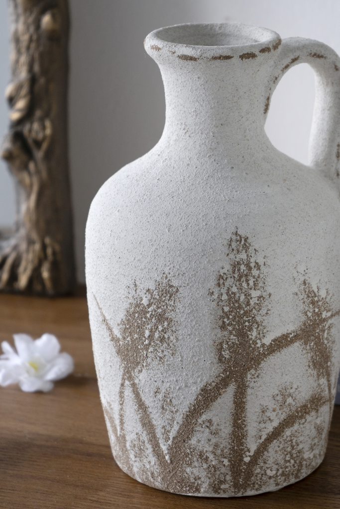Drawing inspiration from the refined beauty of vintage European pottery, this vase features a classic pitcher silhouette, a worn white finish, and elegant brown grass patterns. Whether displayed empty or filled with a collection of flowers, it will capture the eye from any tabletop, mantel, dresser, or sideboard.