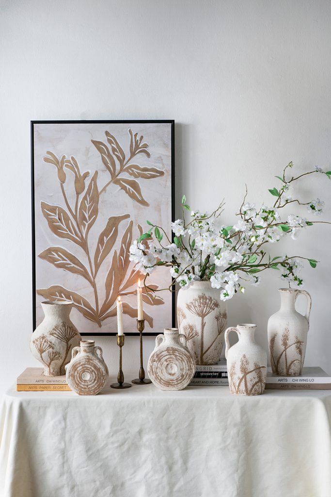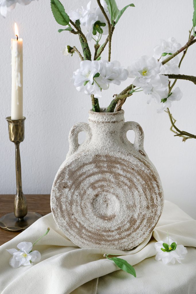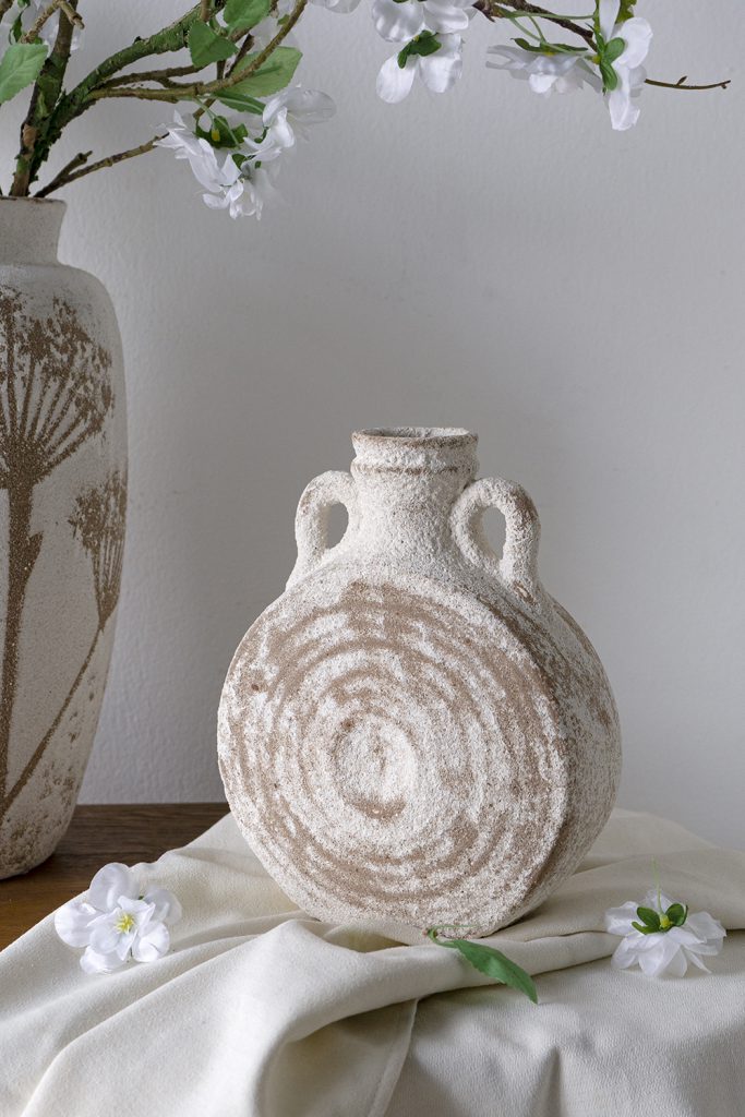 The distressed texture and unique shape allow this vase to complement farmhouse, bohemian, wabi-sabi, and traditional themes, ensuring it can slot into any setting seamlessly
