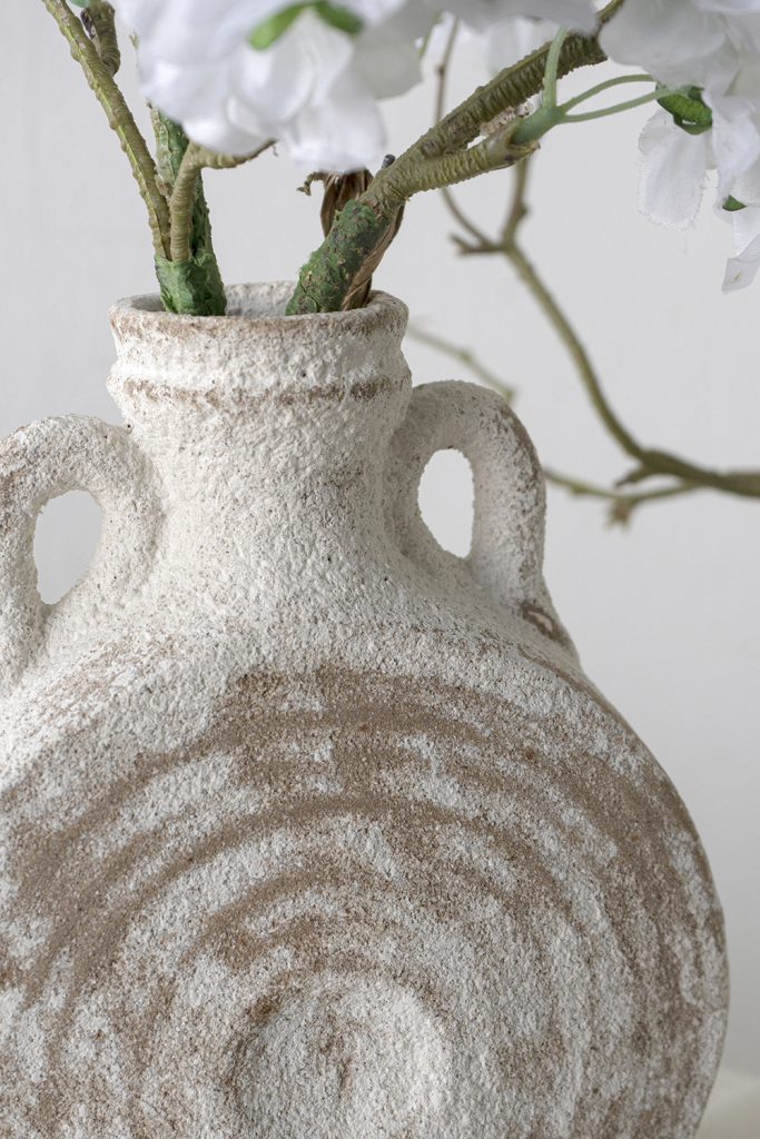 Reimagining classic Mediterranean pottery as a versatile home accent, this vase features a round, rugged silhouette, a worn white finish, and weathered brown details. Display it on your living room mantel, office bookshelf, or bedroom dresser to infuse your decor with a burst of organic intrigue.