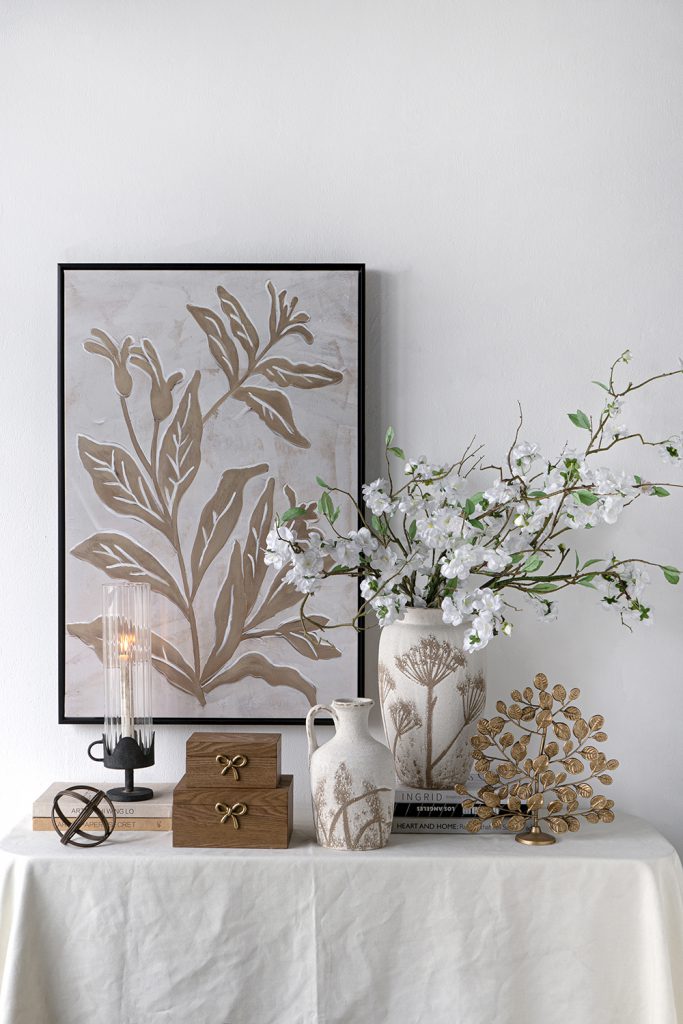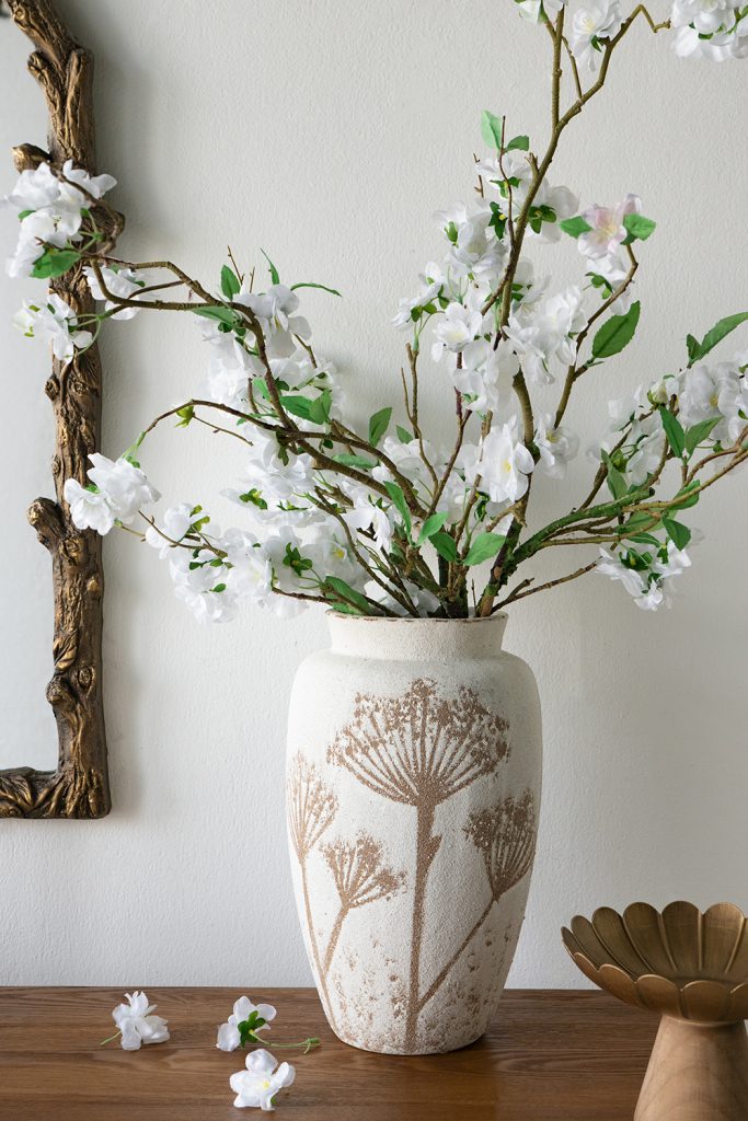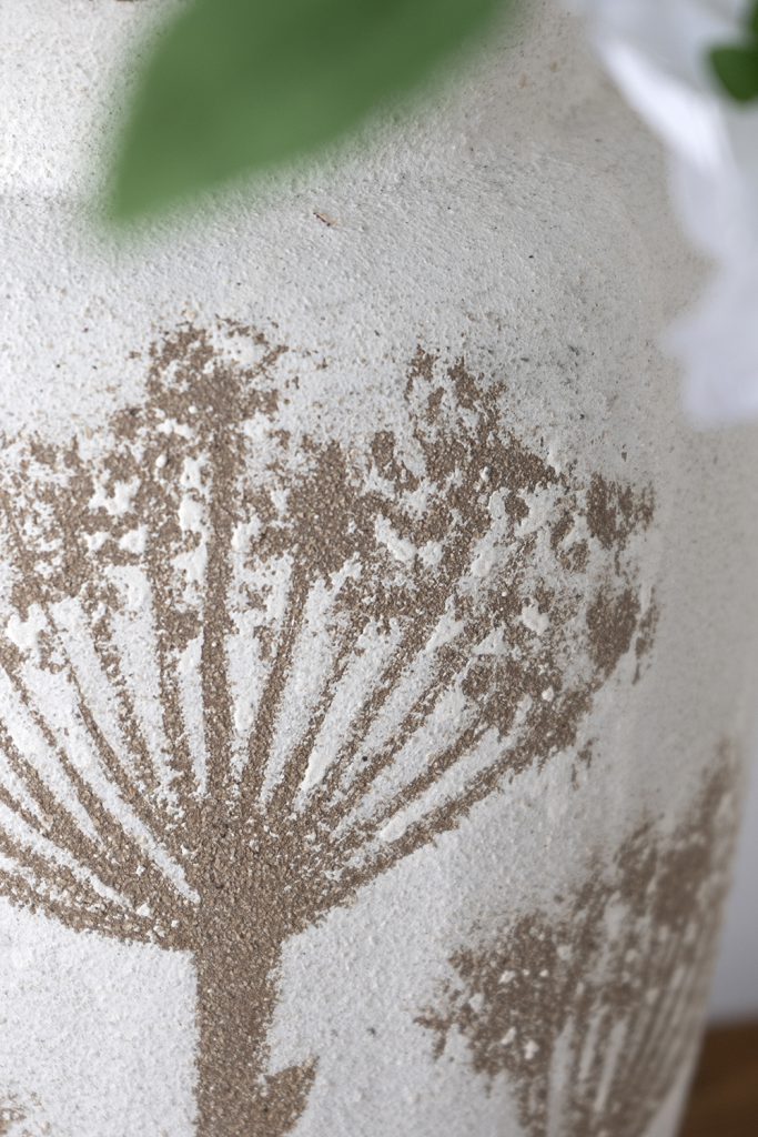 Blending the intrigue of classic European pottery with the effortless charm of nature, this vase features a cylindrical silhouette, an earthy white finish, and abstract brown wildflower patterns. Whether displayed alone or paired with lush florals, it is certain to capture the eye from any tabletop, mantel, or dresser.