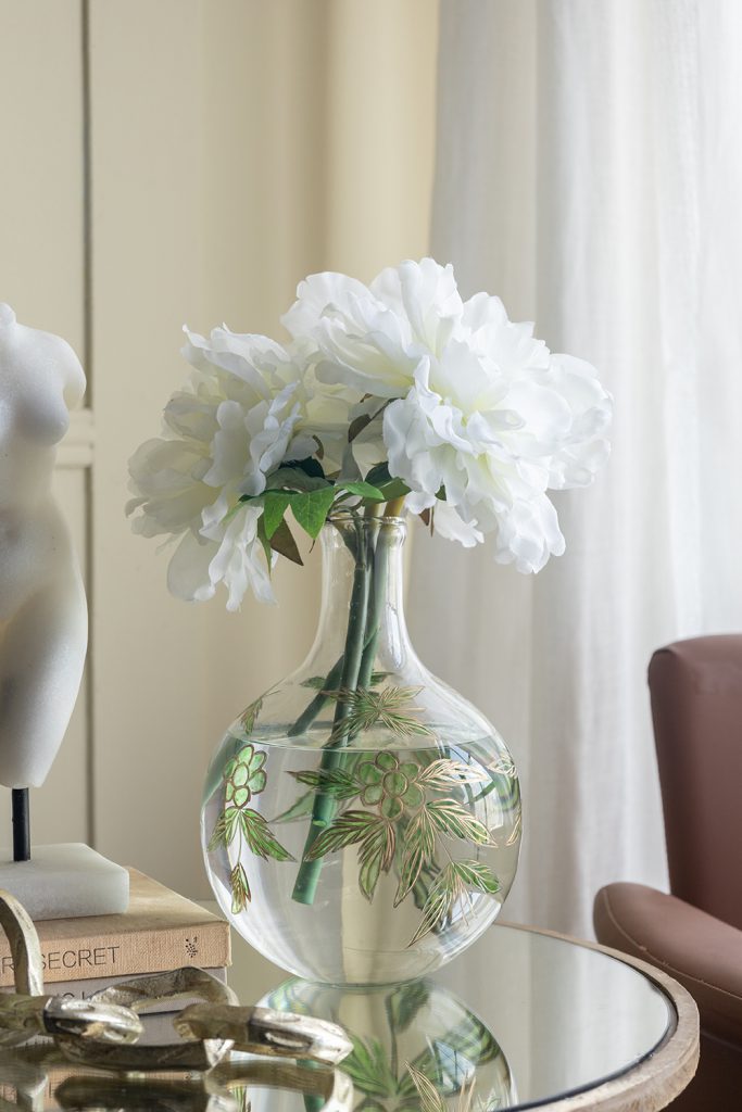 Marrying the serene beauty of nature with a touch of classic artistry, this vase features a wide, bulbous silhouette, a short, slender neck, and a delicate blend of green and gold botanical motifs. Whether displayed alone or filled with your favorite blooms, it will fit perfectly on a tabletop, dresser, or console.