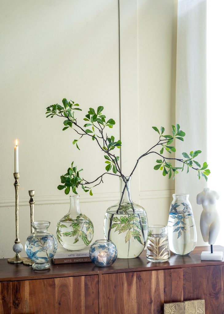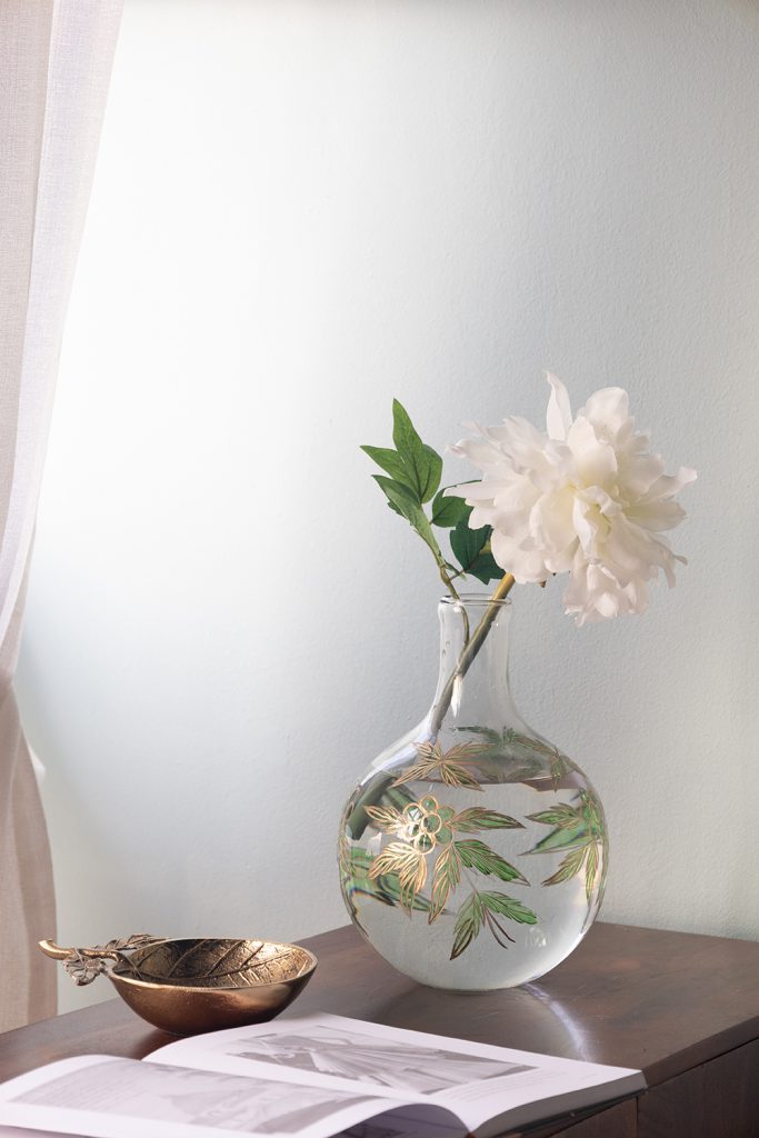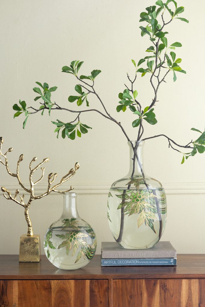 D8x11" Bulbous Clear Glass Vase with Slender Neck and Green and Gold Botanical Motifs 4EA/CTN