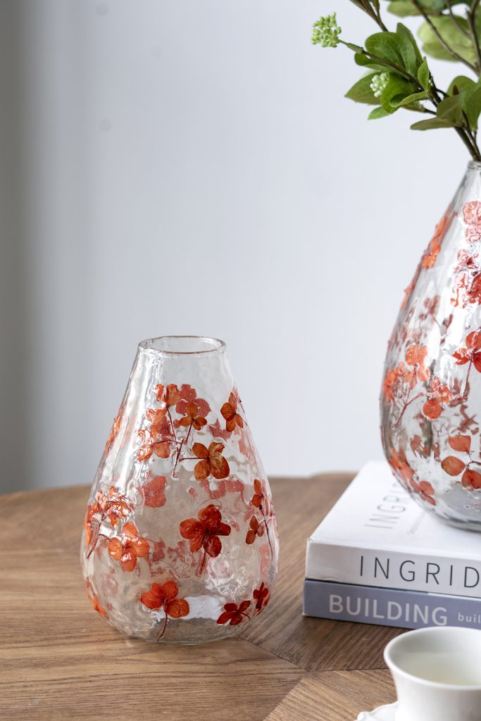 Blending classic design with the carefree beauty of nature, this vase features a sleek, rounded silhouette, an elegant clear hue, and vibrant red botanical patterns. Whether displayed alone or filled with your favorite blooms, it fits perfectly on any tabletop, mantel, or console.