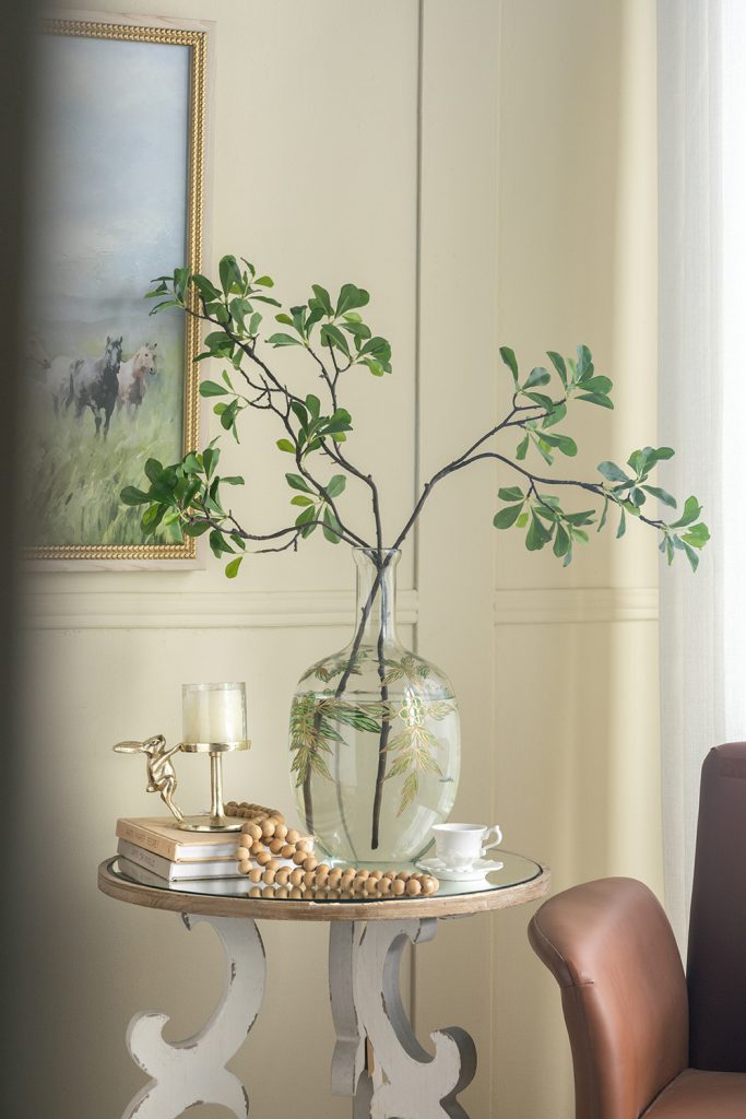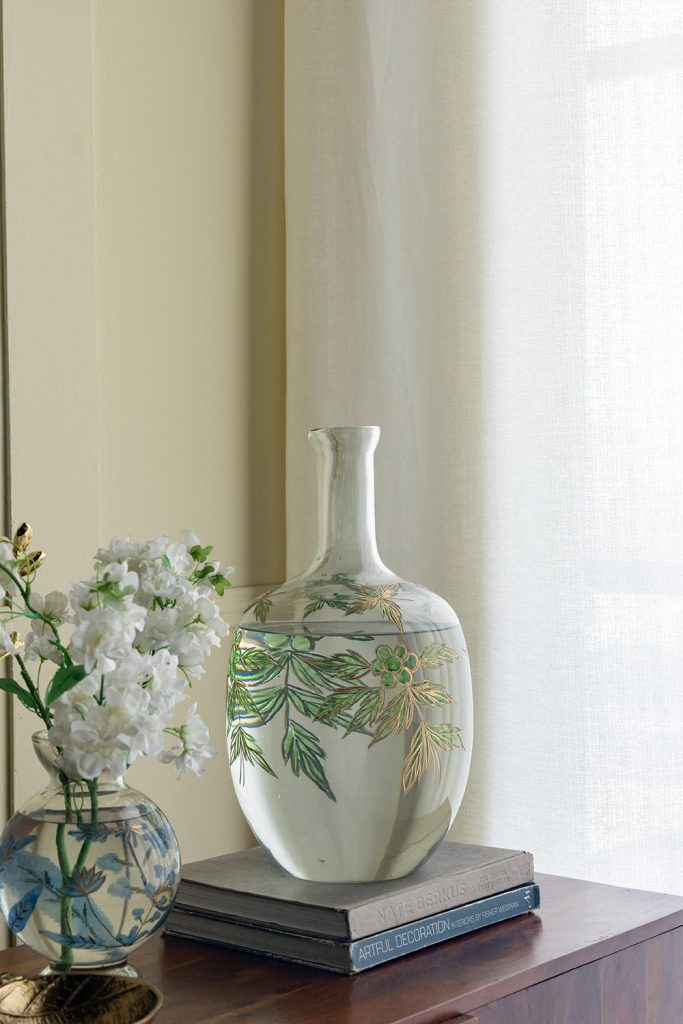 Marrying the serene beauty of nature with a touch of classic artistry, this vase features a wide, bulbous silhouette, a long, slender neck, and a delicate blend of green and gold botanical motifs. Whether displayed alone or filled with your favorite blooms, it will fit perfectly on a tabletop, dresser, or console.