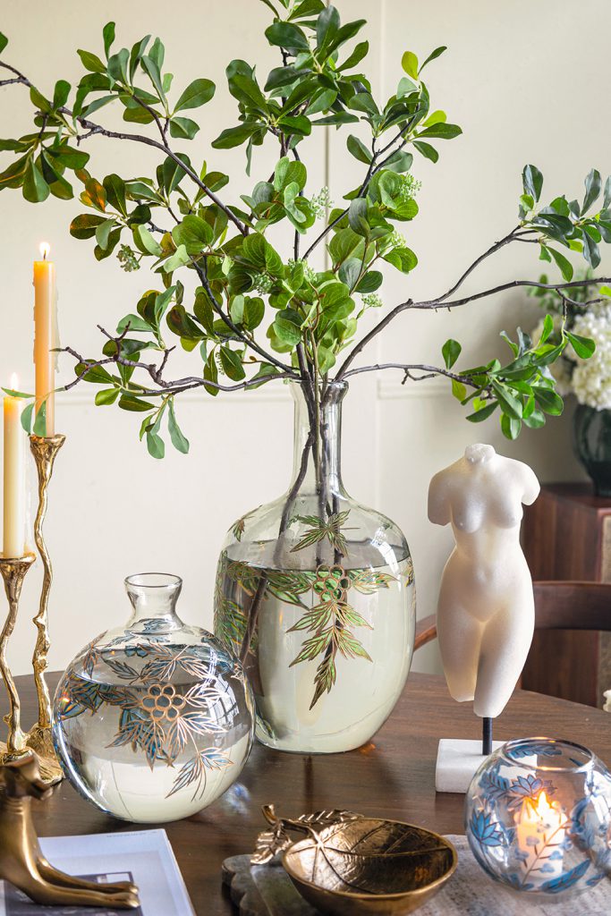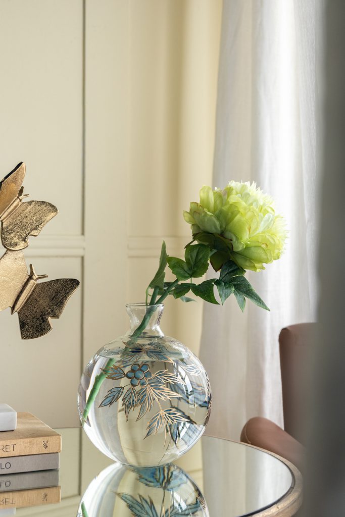Marrying the rich beauty of classic art with the effortless charm of nature, this vase boasts a wide, rounded silhouette with blue and gold botanical motifs. Perfectly sized to be displayed alone or paired with a lush floral arrangement, it will capture the eye from any tabletop, mantel, or sideboard.