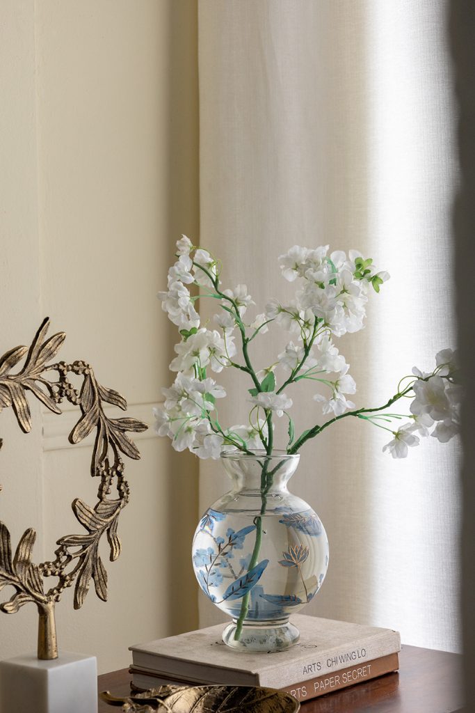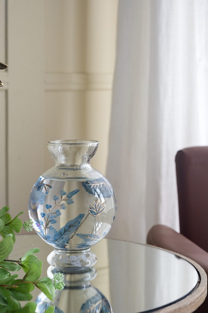 Marrying the rich beauty of classic art with the effortless charm of nature, this vase features a round, bulbous silhouette, a short pedestal base, and delicate botanical motifs in soft blue and rich gold. Perfectly sized to be displayed alone or paired with a lush floral arrangement, it is sure to draw the eye from any tabletop, mantel, or sideboard.