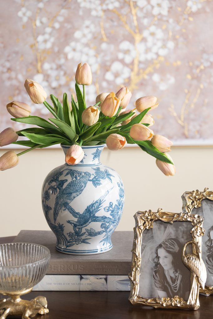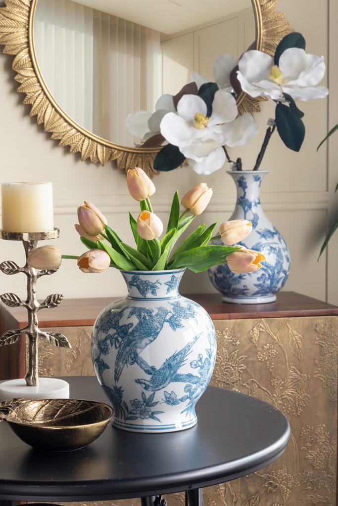 The ornate detailing and bright colorway allow this vase to complement traditional, French Country, transitional, and coastal themes, ensuring it can seamlessly slot into any setting