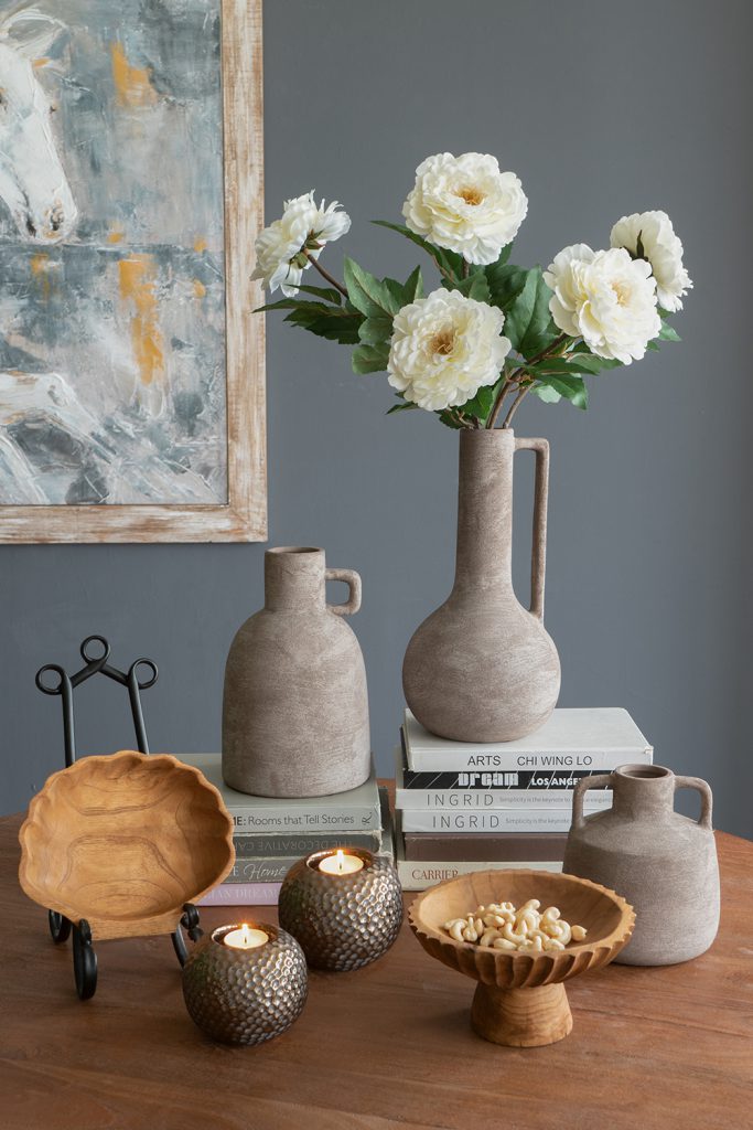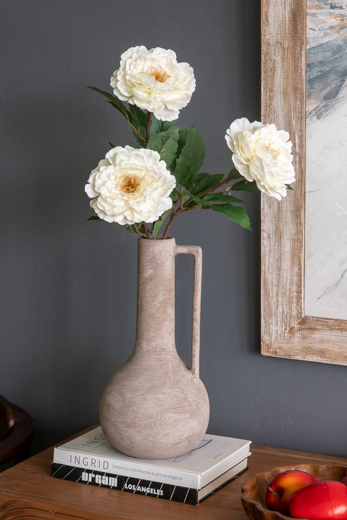 The soft, muted colorway and handcrafted form allow this vase to complement transitional, wabi-sabi, organic modern, and rustic themes, ensuring it blends seamlessly into any setting