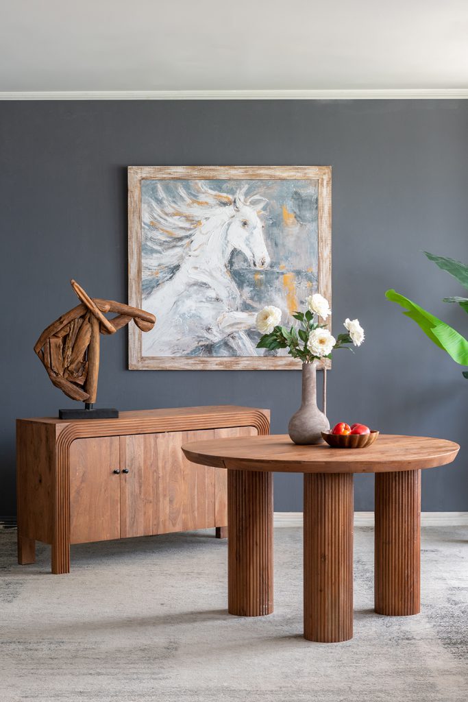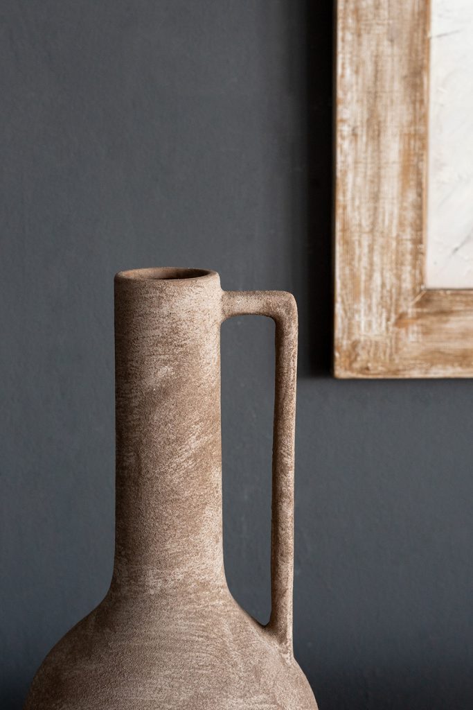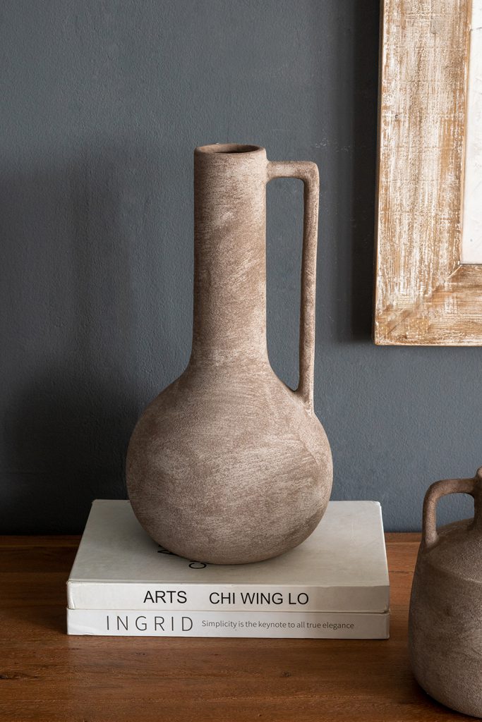 Drawing inspiration from the rugged beauty of antique water jugs, this vase features a round, sculptural silhouette, a long, slender neck, and an earthy gray finish. Whether displayed alone or paired with vibrant florals, it adds a burst of natural charm to your living room, entryway, bedroom, or office.