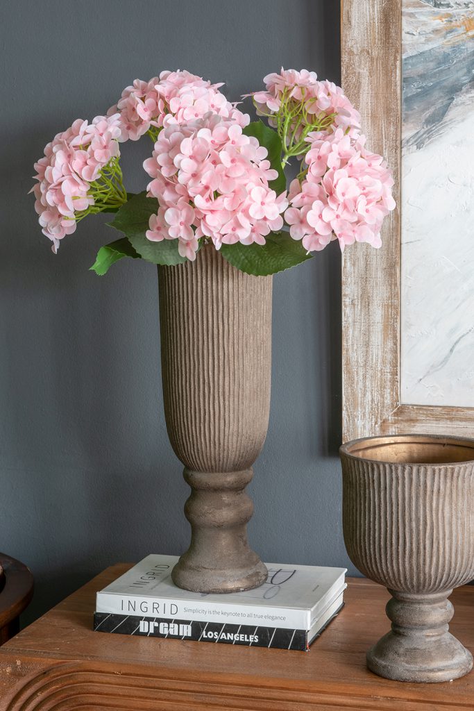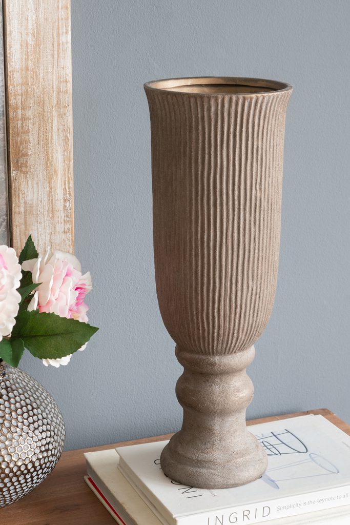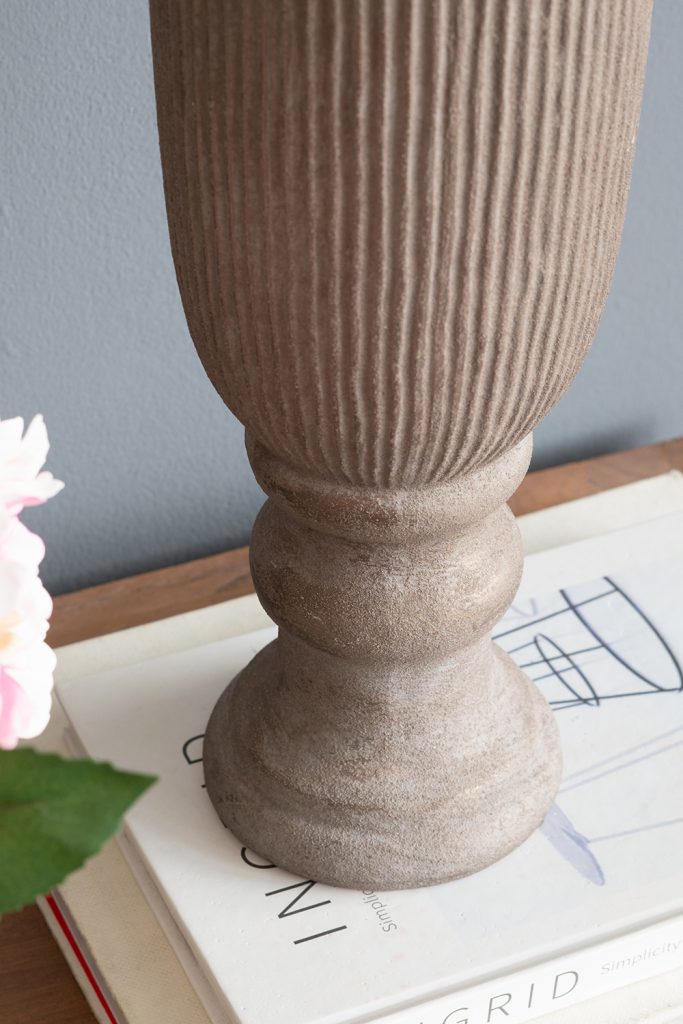 Inspired by the rugged beauty of old-world urns, this vase features a slender, ridged silhouette, a rounded pedestal base, and a refined bronze finish. Whether displayed alone, included in a classical ensemble, or paired with tall stems, it is sure to draw the eye from any table, sideboard, or dresser.