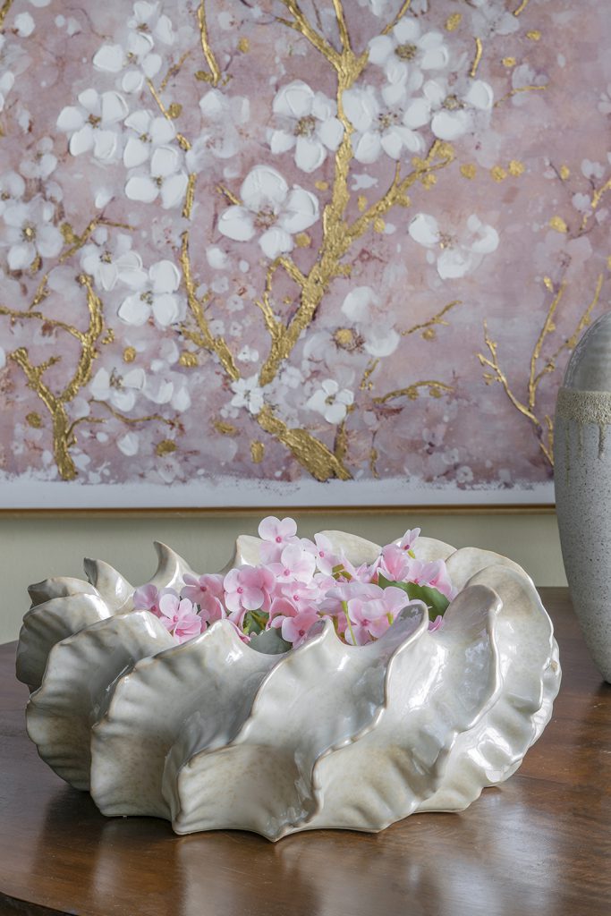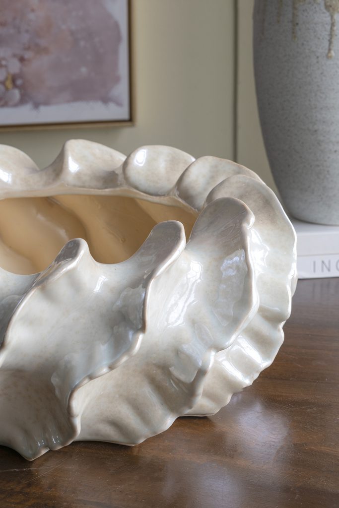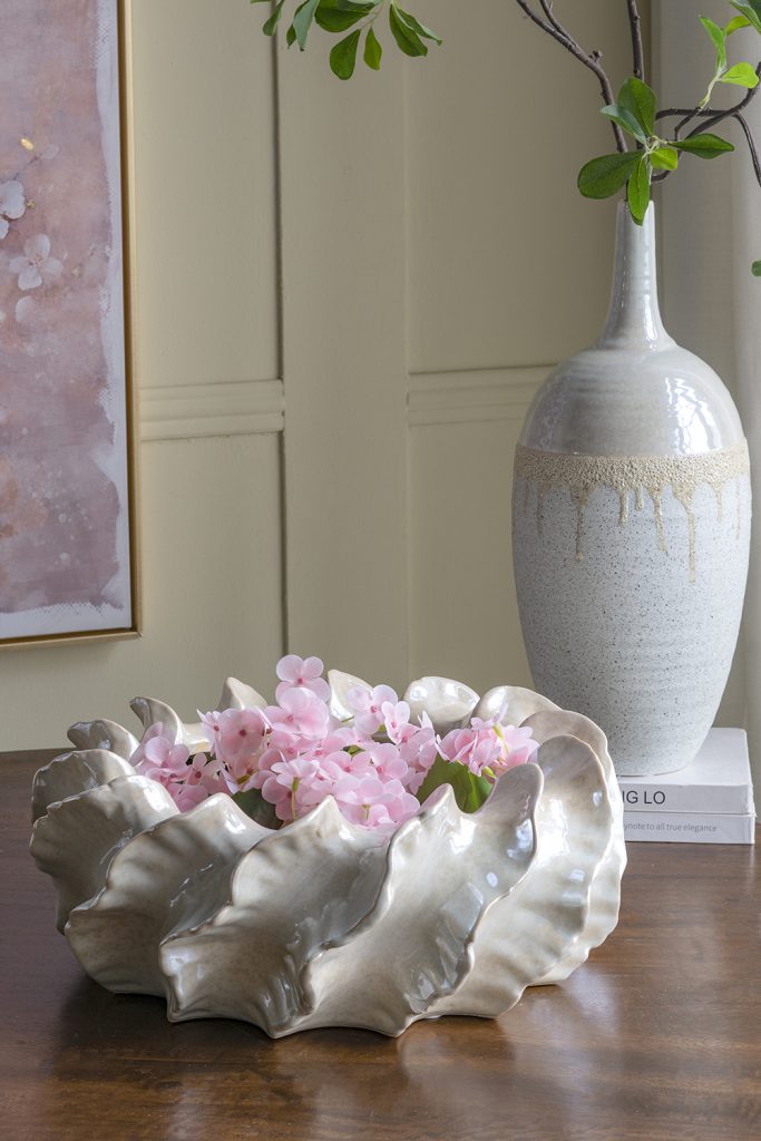 Drawing inspiration from the effortless beauty of the ocean, this vase features a shallow, sculptural silhouette, an intricate wavy texture, and a stunning reactive glaze that flows through shades of beige, gray, and ivory. Whether displayed alone or filled with decorative orbs or faux greenery, it is sure to capture the eye from any tabletop, fireplace mantel, or dresser.