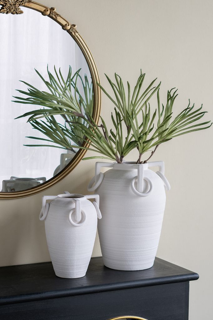 Inspired by the rugged allure of ancient water vessels, this vase features a refined amphora-like silhouette, an elegant white finish, and intricately sculpted loop handles. Perfectly sized to make an impression on any tabletop, mantel, or dresser, it elevates your decor whether displayed alone or paired with vibrant florals.