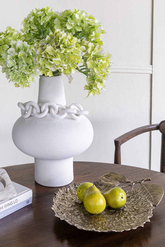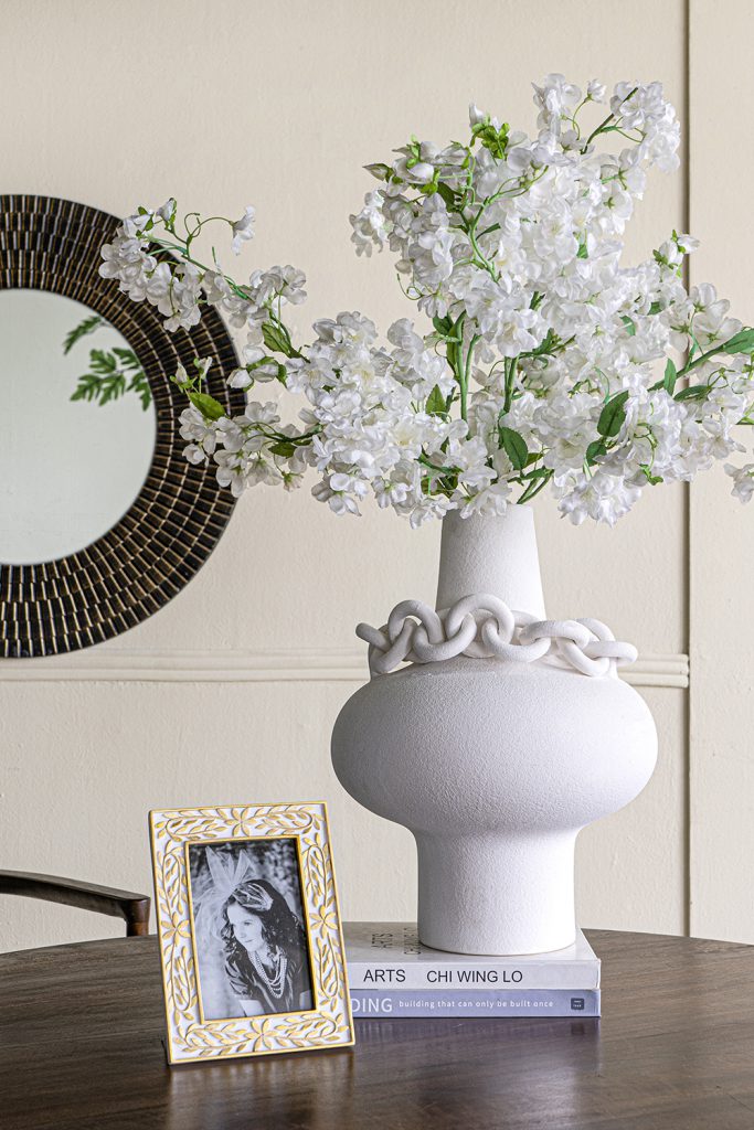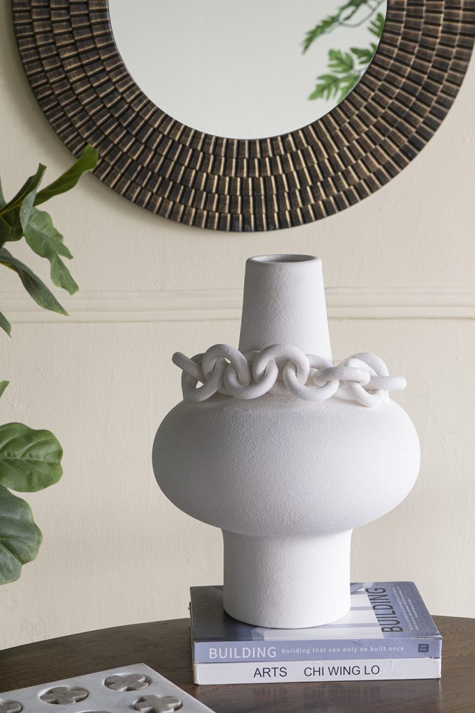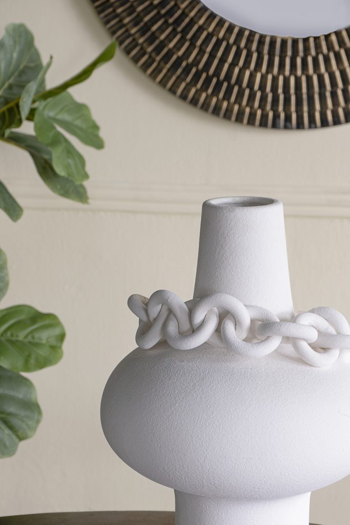 Transforming the classic bottle silhouette into a striking work of art, this vase features a wide, sculptural form, a short, narrow neck, and an intricate chain-like accent. Finished in elegant white, it will draw the eye whether displayed alone or paired with lush florals.