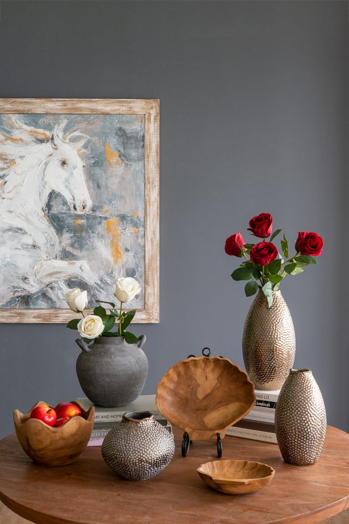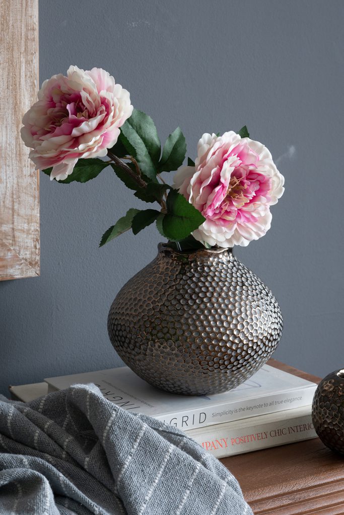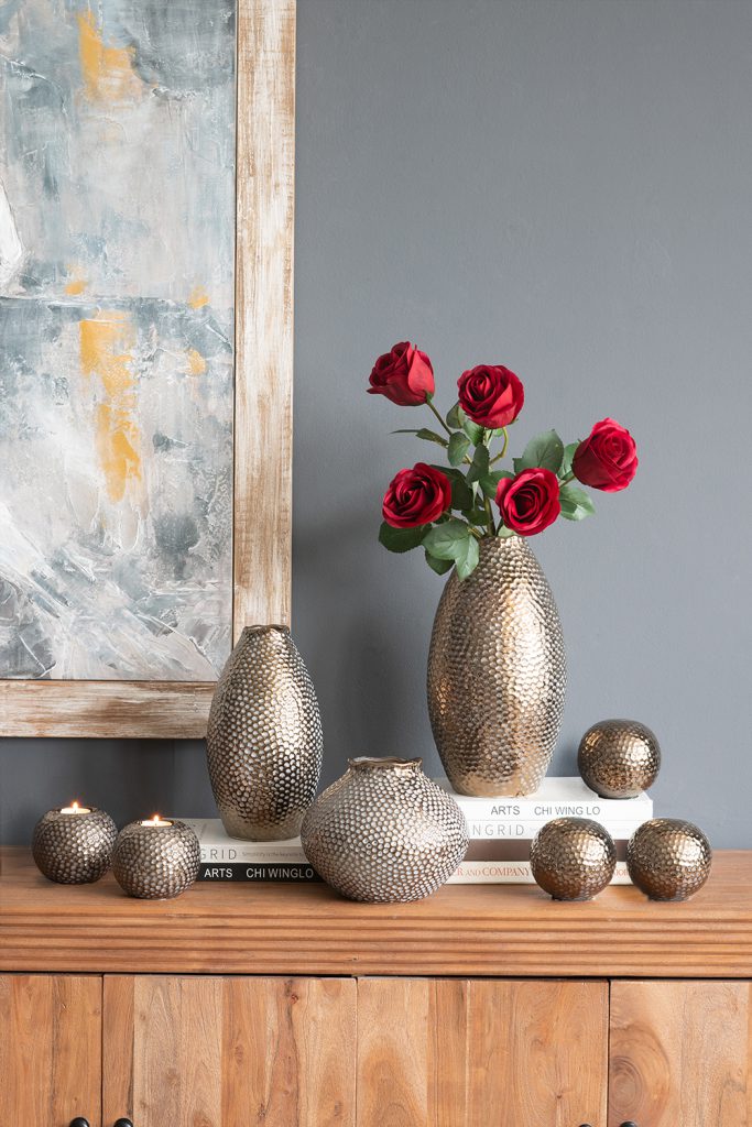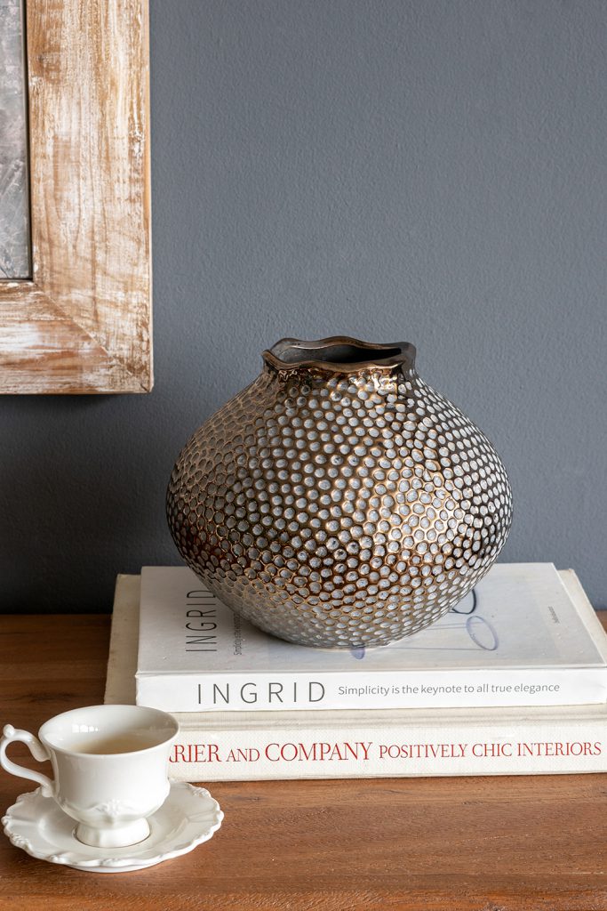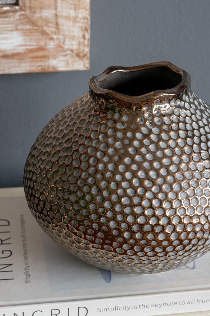 Seamlessly blending timeless design with modern style, this vase features a wide, rounded silhouette, a distinctive hammered texture, and a refined bronze finish. Whether displayed on its own or paired with vibrant short-stemmed florals, it is sure to catch the eye on any tabletop, mantel, sideboard, or shelf.