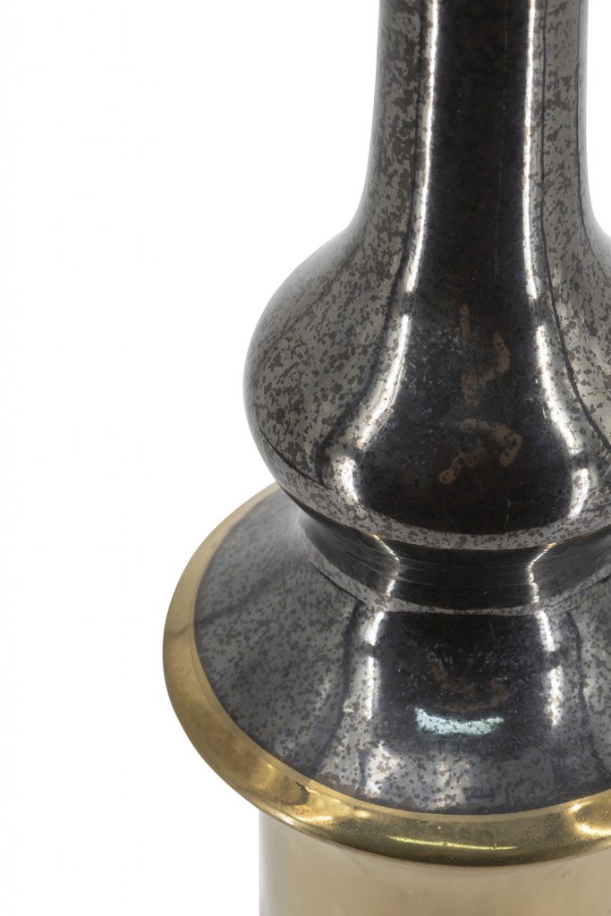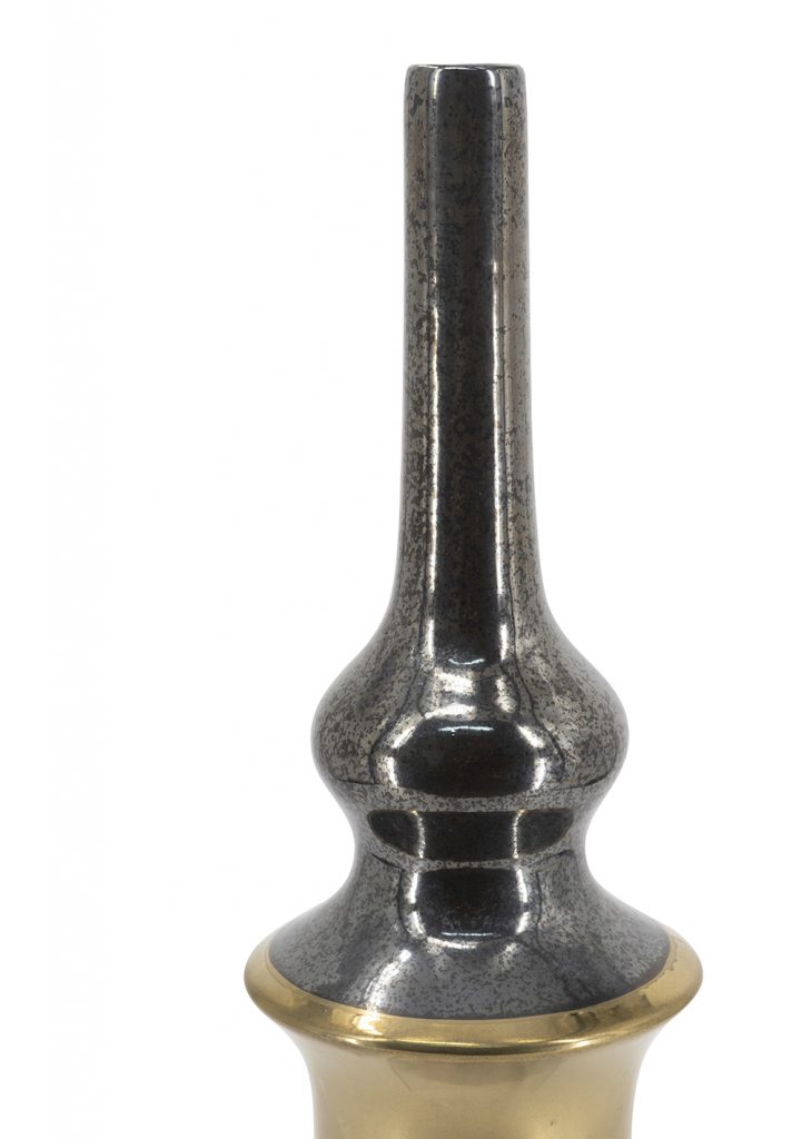 Add sophisticated drama to your space with this tall ceramic vase in deep black with a speckled metallic texture, transitioning to a warm gold base for luxurious contrast. Its elegant tapered shape flares at the bottom, creating a sculptural silhouette ideal for stems, branches, or standalone display. It enhances modern, industrial, or glam interiors on mantels, floors, or tables.