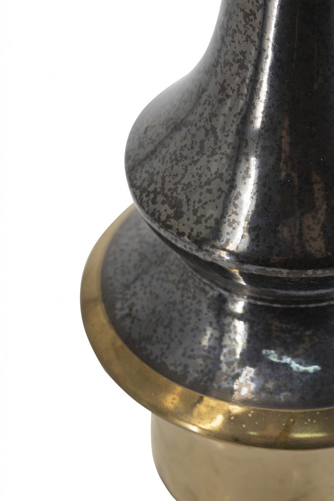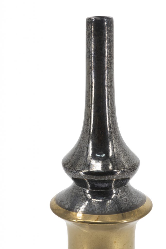 Add sophisticated drama to your space with this tall ceramic vase in deep black with a speckled metallic texture, seamlessly transitioning to a warm gold base for luxurious contrast. Its elegant tapered shape flares at the bottom, creating a sculptural silhouette ideal for stems, branches, or standalone display. It enhances modern, industrial, or glam interiors on mantels, shelves, or tables.