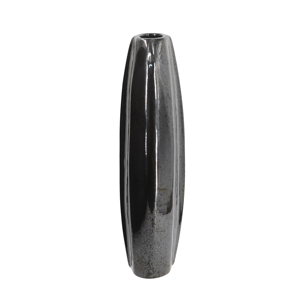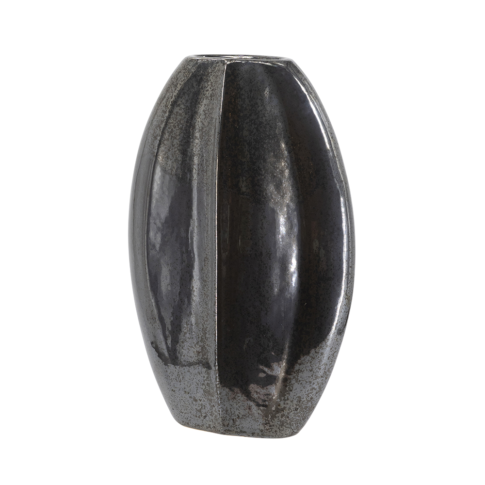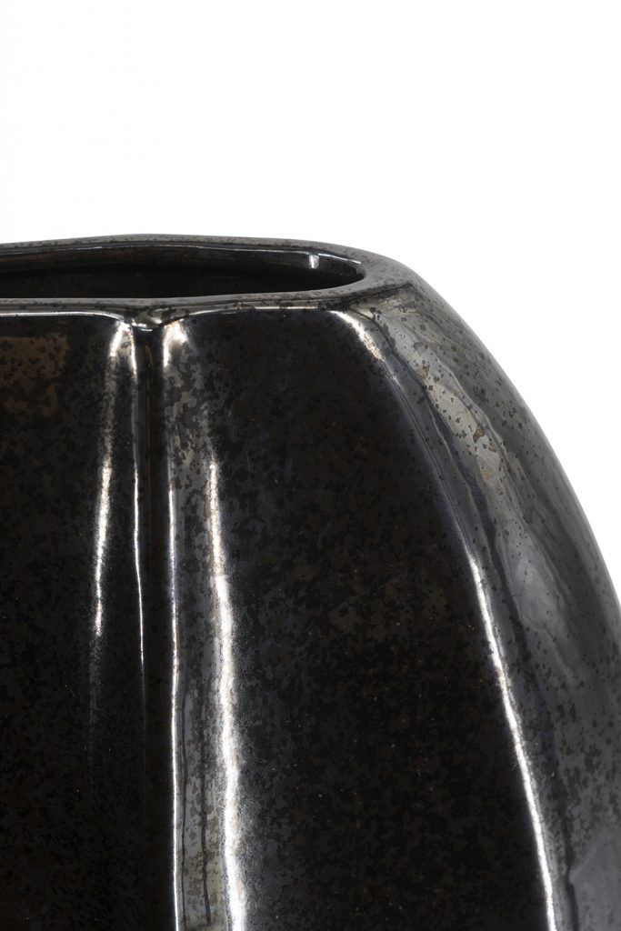 Elevate your decor with this sleek ceramic vase in deep black with a metallic sheen and faceted sides for a contemporary, sculptural look. The distressed texture adds subtle depth, perfect for fresh stems, dried branches, or as a standalone statement piece. It suits modern, industrial, or minimalist spaces on mantels, shelves, or tables for instant sophistication.