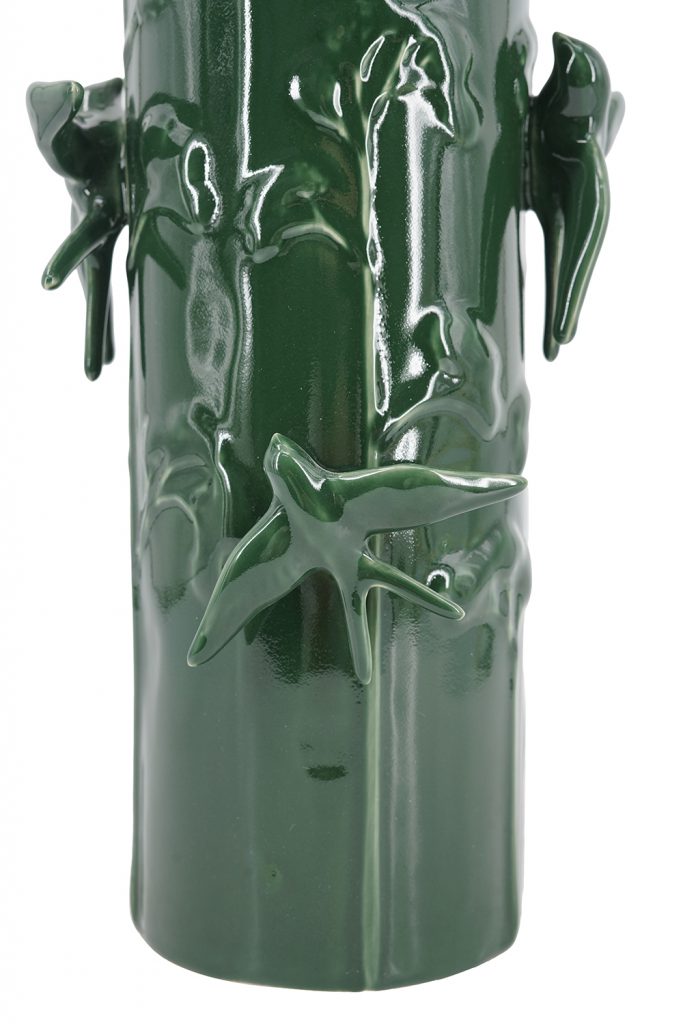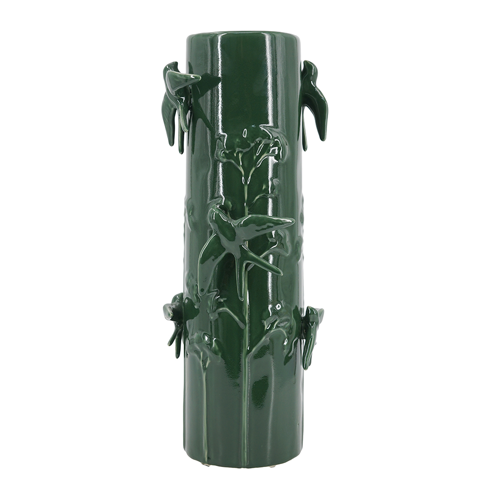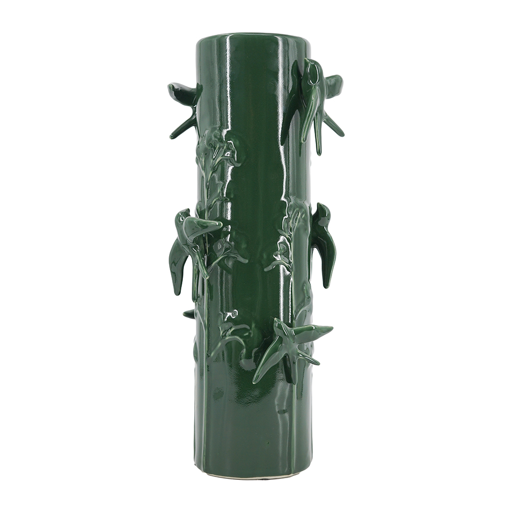Bring nature indoors with this elegant ceramic vase in deep forest green, adorned with intricately sculpted birds perched on twisting vines for a whimsical, organic touch. Its cylindrical shape adds height and drama, perfect for tall stems, branches, or as a standalone statement. It enhances boho, rustic, or modern spaces on floors, mantels, or shelves with glossy finish and artistic detail.
