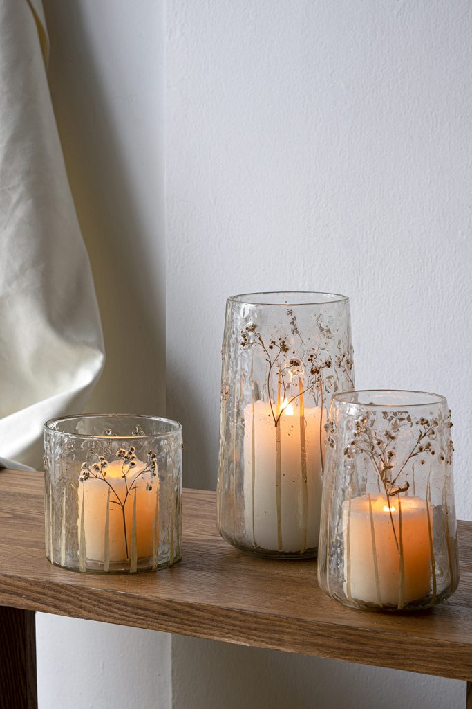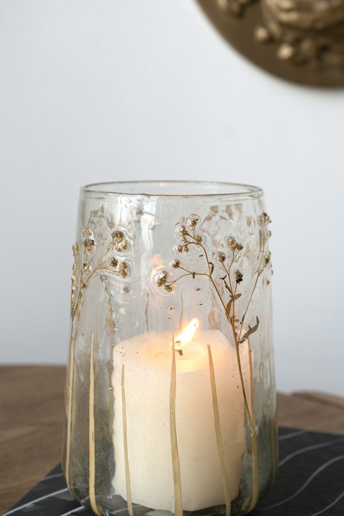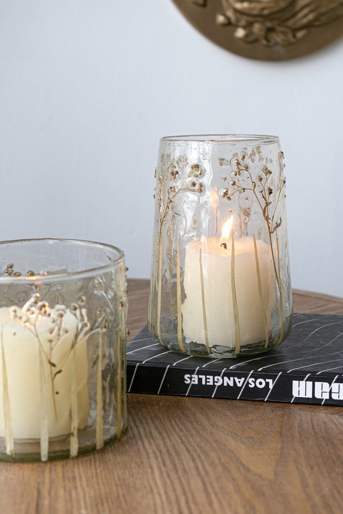 Infusing classic design with a touch of nature, this candle holder features a simple, rounded silhouette adorned with sprawling green wildflower motifs, evoking the freshness of spring meadows. Perfectly sized for a votive or tealight candle, it casts a warm, soothing glow throughout any space.