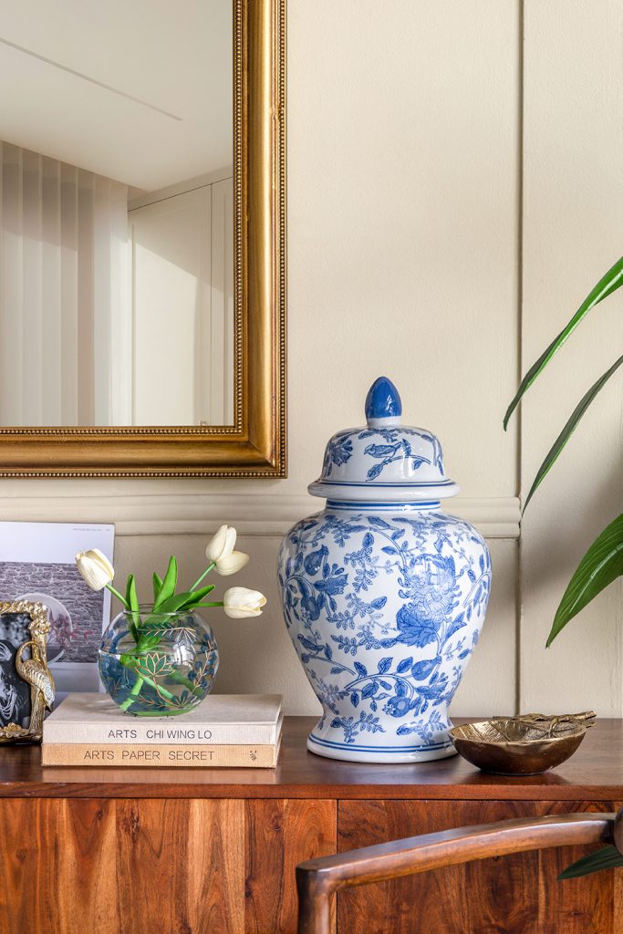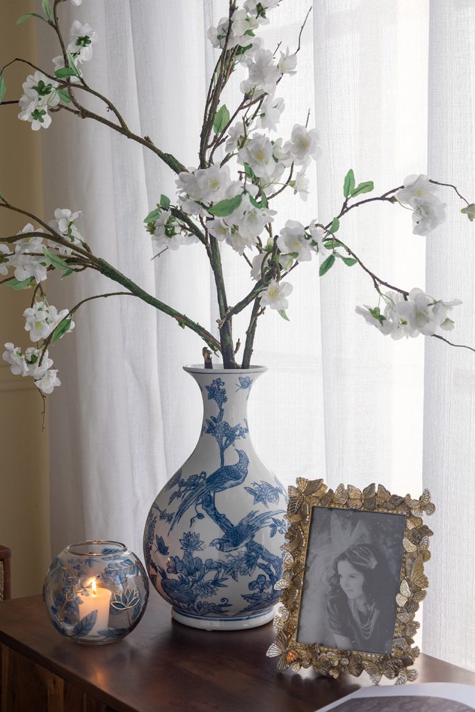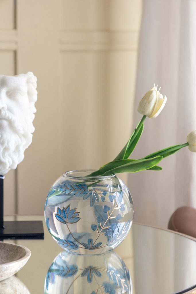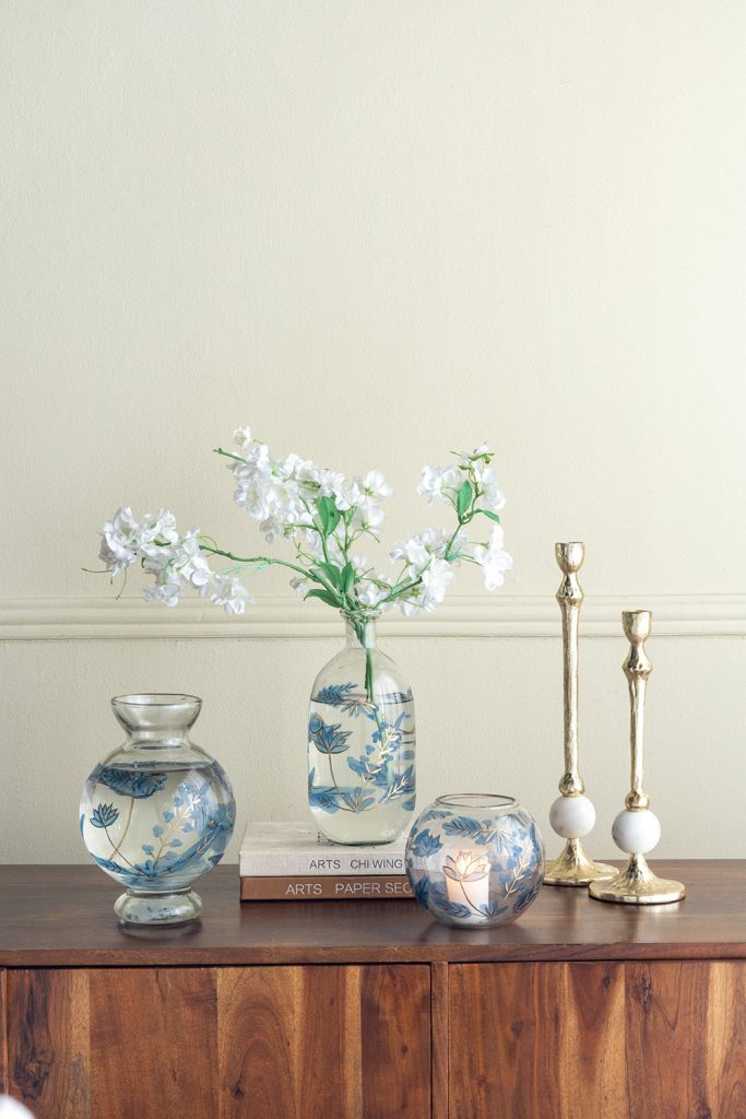 Blending the allure of vintage watercolor art with the charm of nature, this candle holder features a short, rounded silhouette adorned with abstract blue leaves and slender gold branches. Perfectly sized for a mantel, tabletop, or nightstand, it elevates your decor while casting a soothing glow when paired with a votive candle.