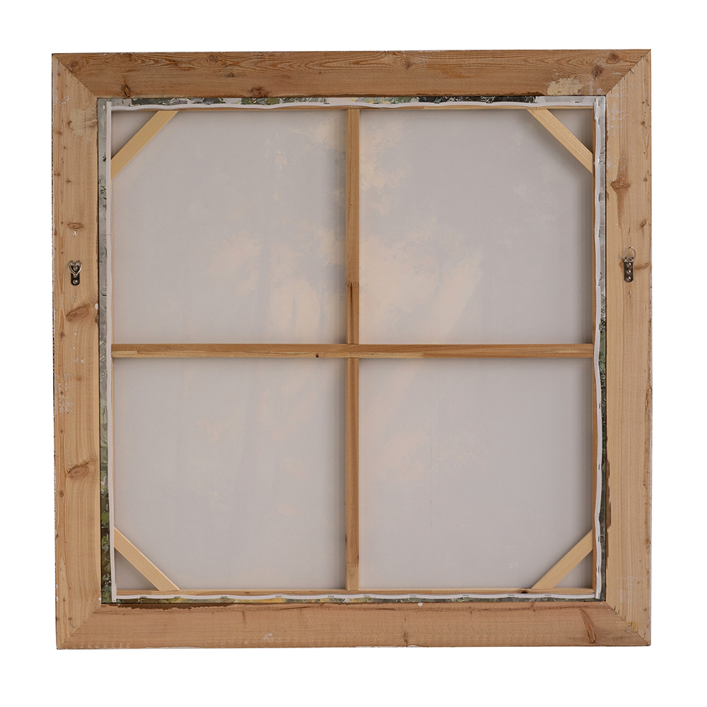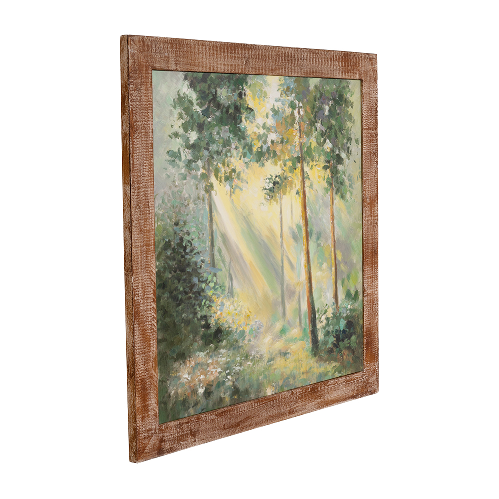 Capturing the tranquil beauty of woodland mornings, this painting depicts a lush green forest with a ray of golden sunlight piercing the canopy. Framed in distressed brown fir wood, it offers lasting durability and easy handling, ensuring it serves as a striking focal point in any living room, entryway, or office.