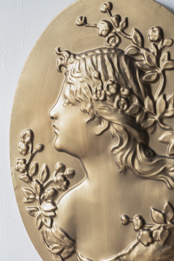 Inspired by the regal beauty of Art Nouveau design, this iron wall plaque features a sleek oval silhouette, a warm antique gold finish, and a delicate lady framed by sprawling flowers and vines. Perfectly sized to bring a touch of classical charm to your gallery wall, living room, or hallway, this piece makes a striking impression whether displayed alone or as part of an elegant arrangement.