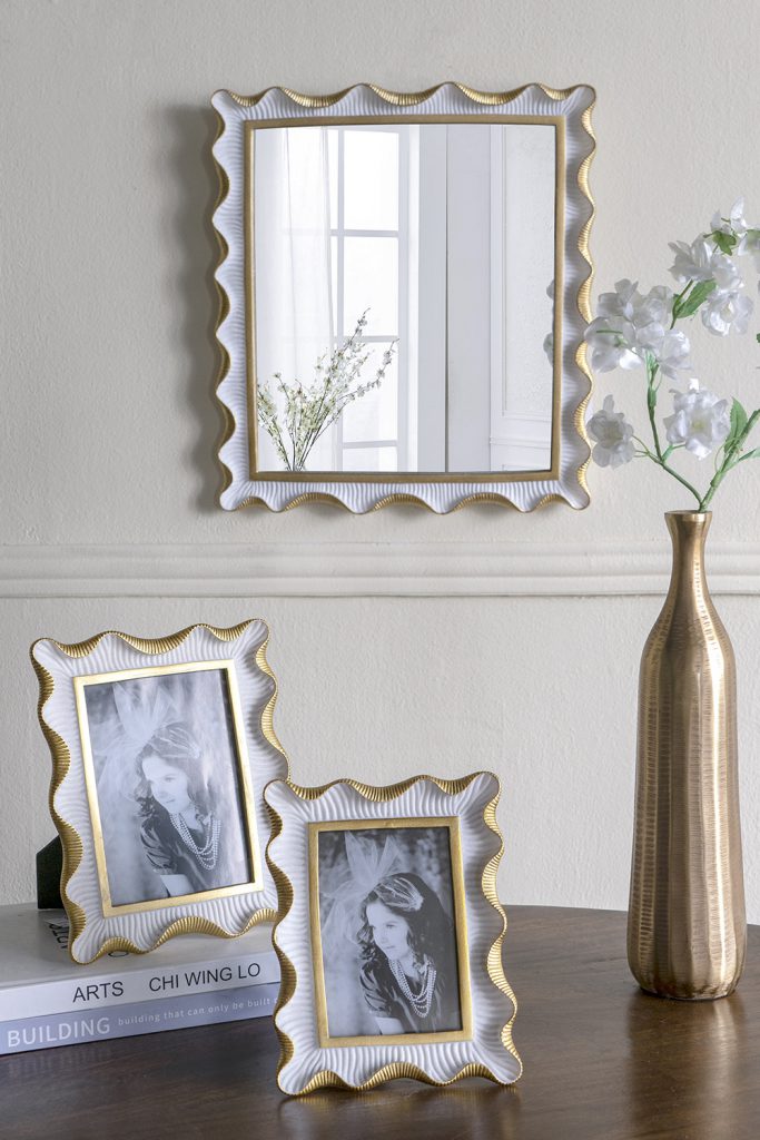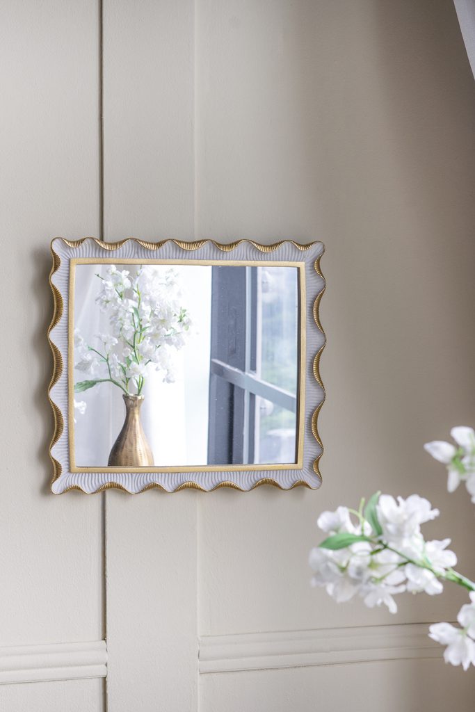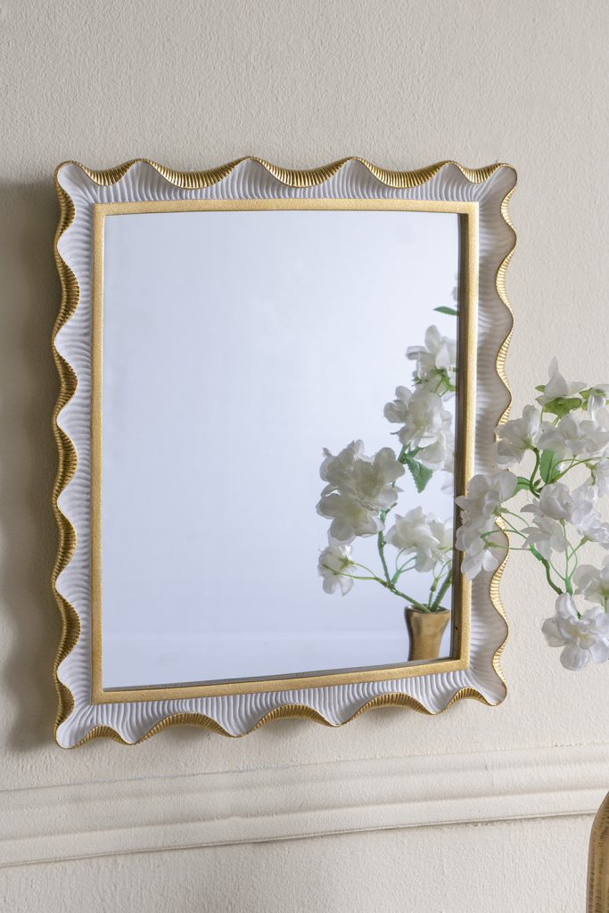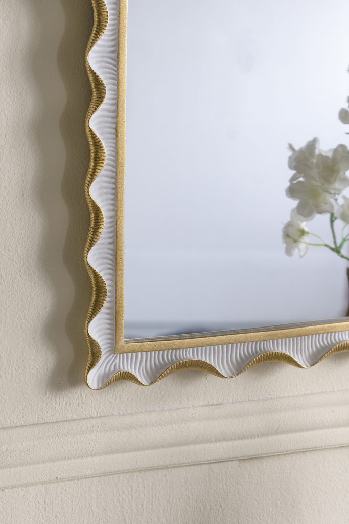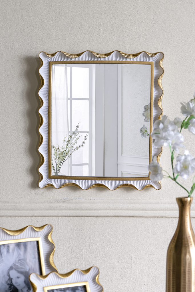 Transforming the classic square silhouette into an elegant focal point, this decorative mirror features a wavy border finished in an alluring blend of white and gold. Whether placed in your living room, entryway, bathroom, or office, the durable stone powder and resin construction ensures long-lasting beauty.