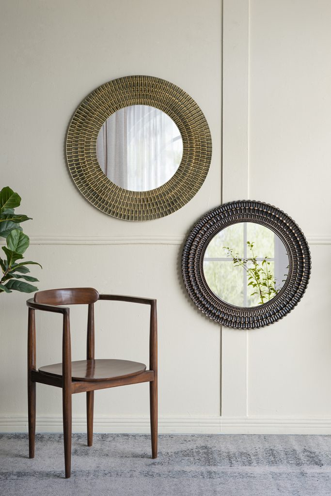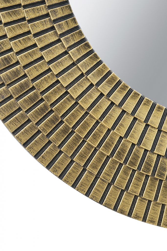 Offering a fresh, sculptural twist on the classic round accent mirror, this piece features a textured design reminiscent of an intricately woven basket. Finished in a rich black and gold blend, it will elevate any wall in the living room, hallway, bedroom, or office.