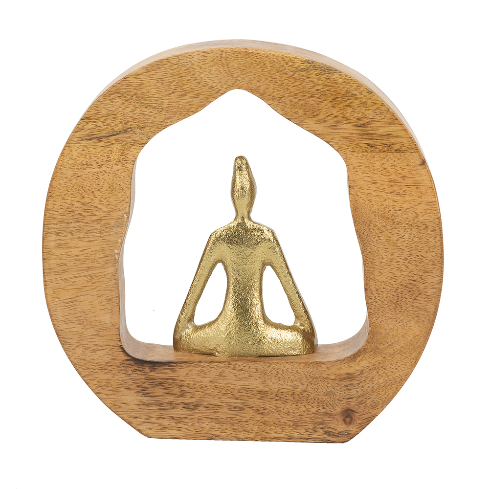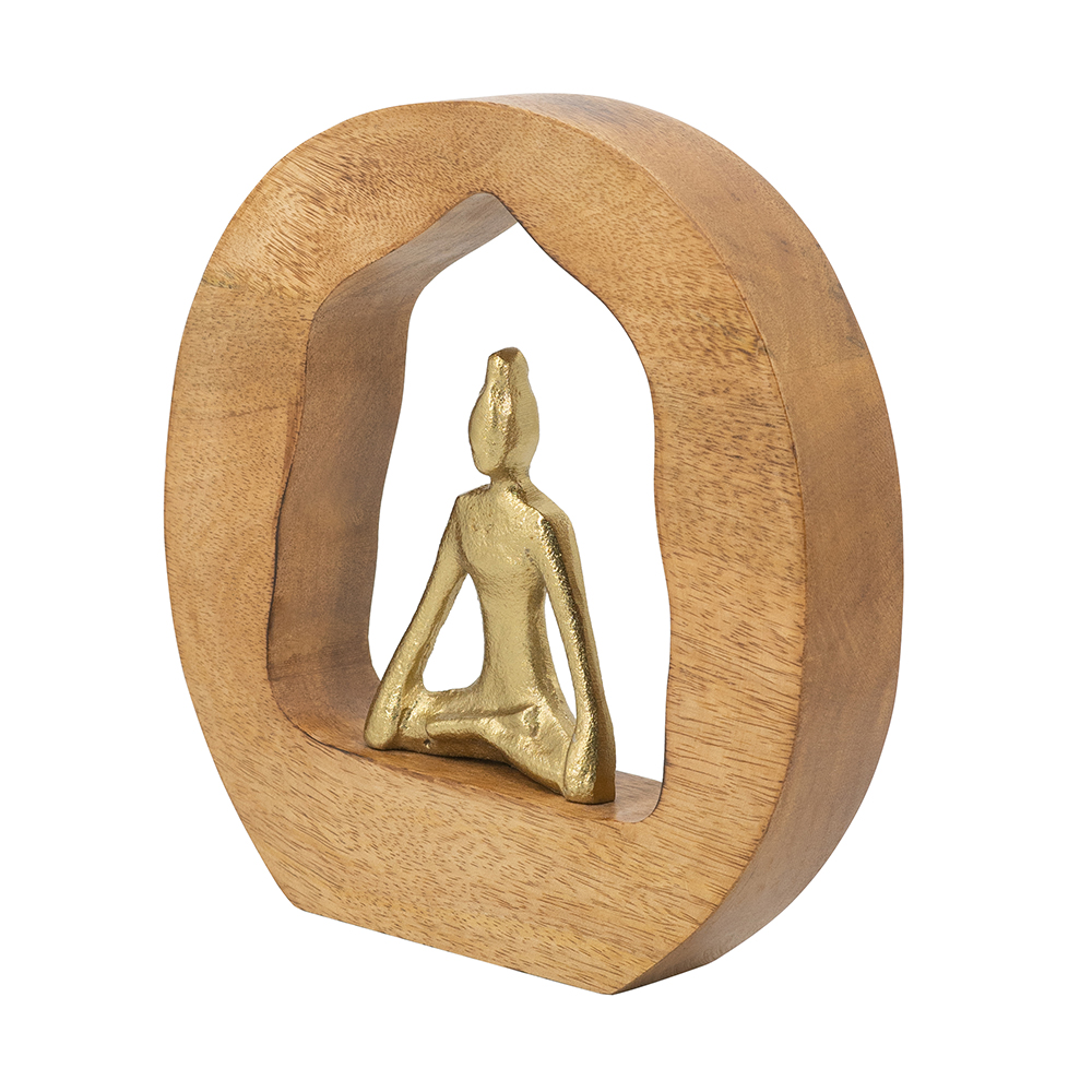Masterfully showcasing the beauty in tranquility, this sculpture depicts an abstract aluminum figurine, sitting peacefully at the center of a genuine mango wood surrounding. An ideal size for your living room tabletop, office desk, or bedroom dresser, this sculpture will infuse your home with a profound sense of relaxation while elevating your existing ensembles.